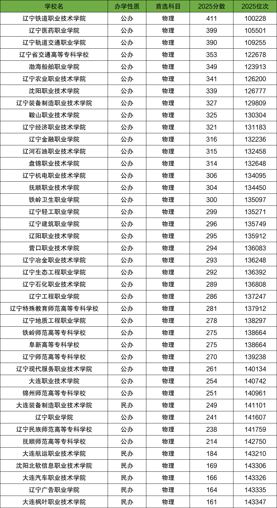 2025年辽宁专科各大学在辽宁物理类最低录取分数线位于161分-411分范围内,位次位于143347名-100228名之间。