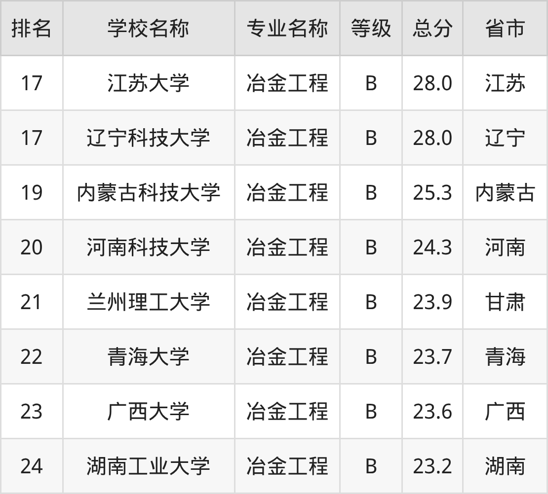 根据软科榜单可知,冶金工程专业全国排名前十的大学分别是:
