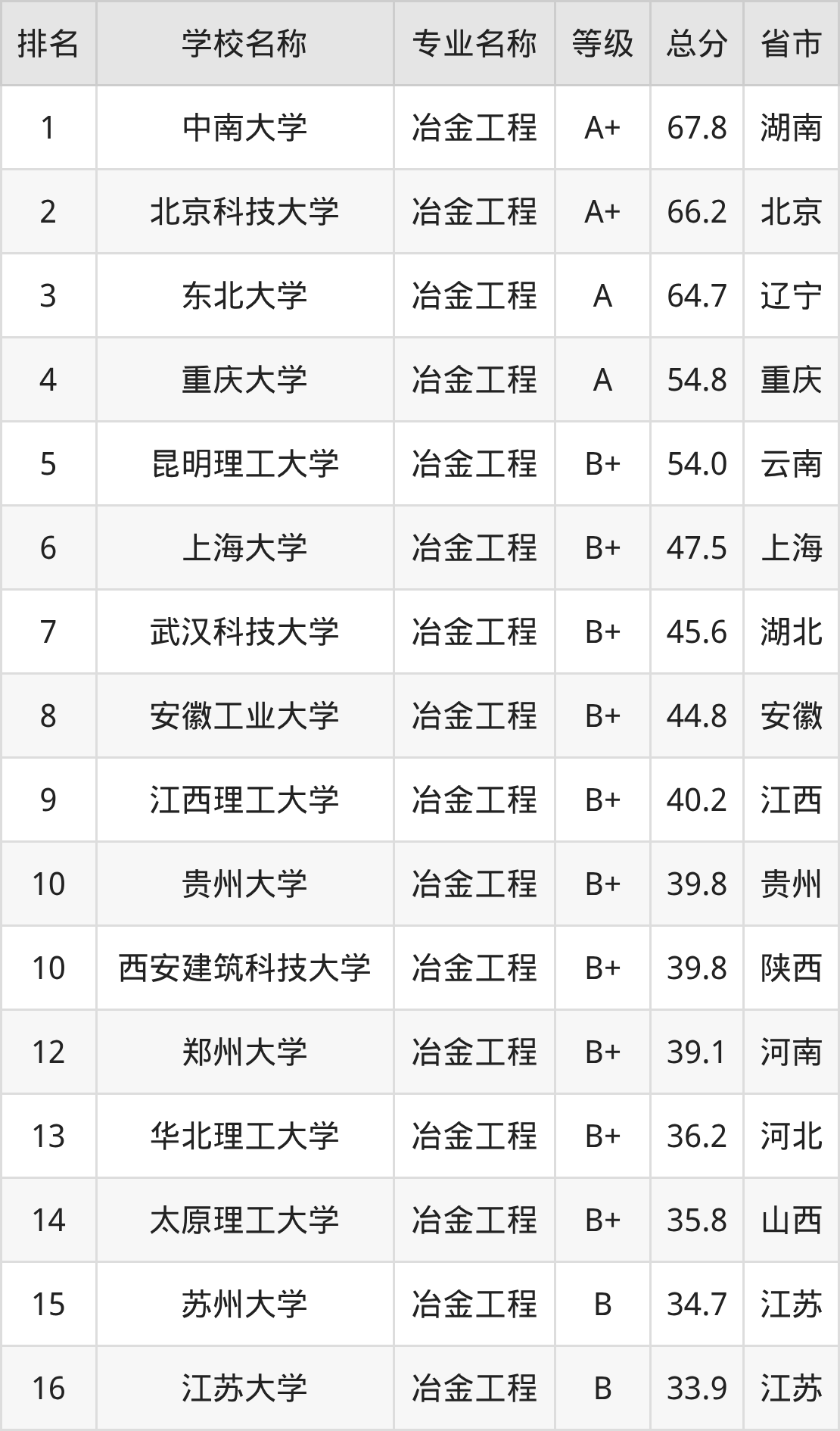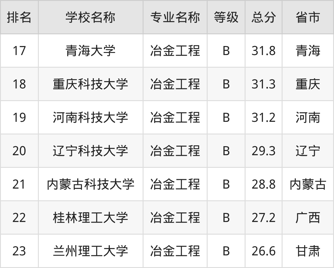 附冶金工程专业全国23所院校排名榜单一览表!
