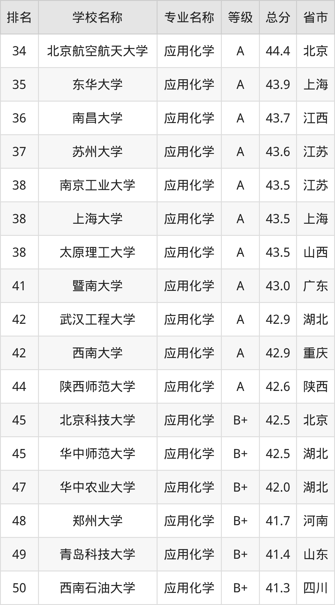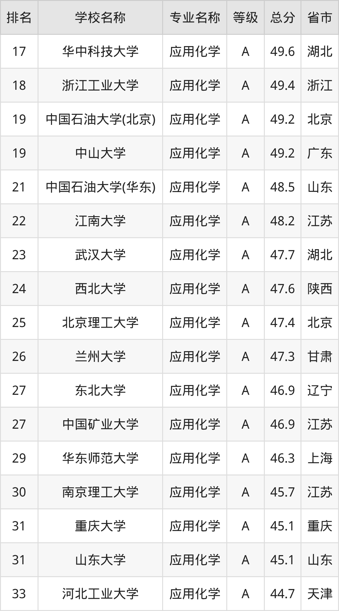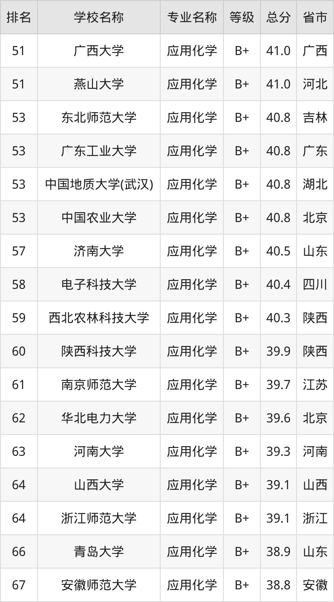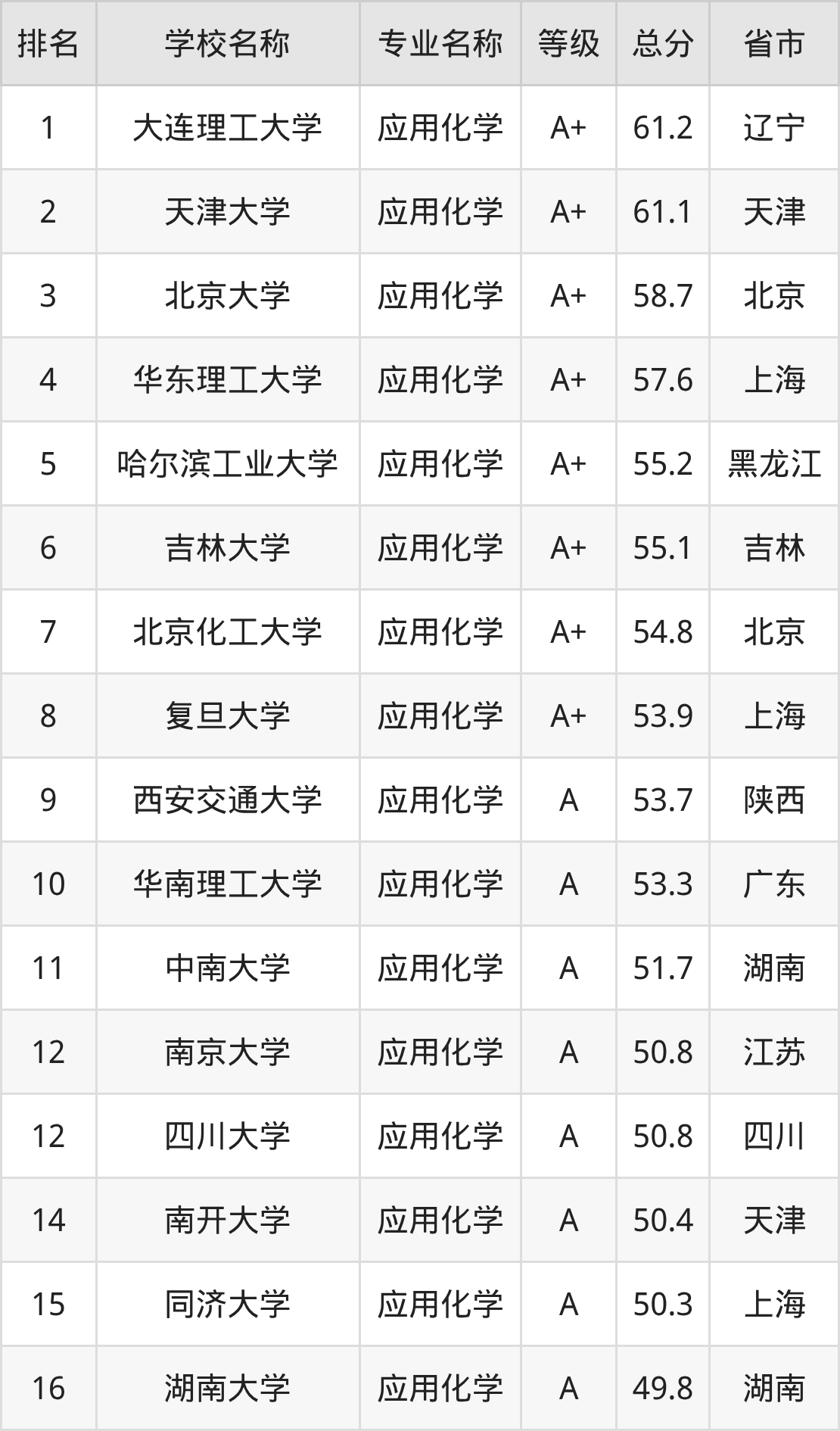 根据软科榜单可知,应用化学专业全国排名前十的大学分别是: