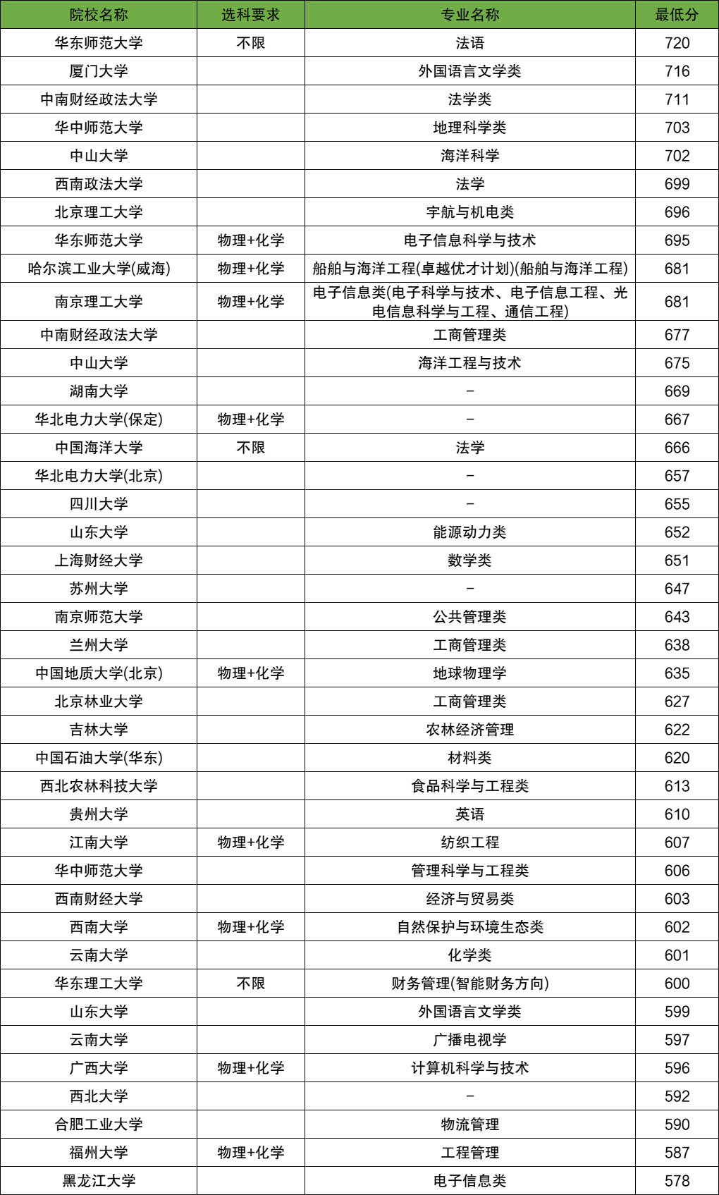 分数最高的学校是华东师范大学,需要720分;分数最低的学校是黑龙江大学,需要578分。