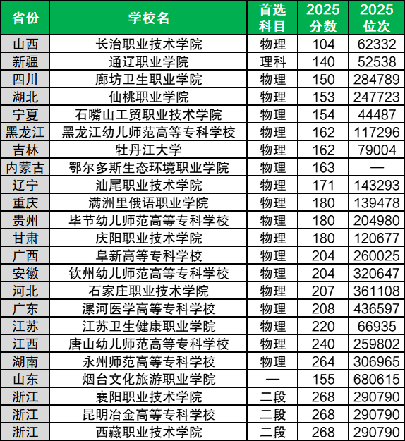 2025年全国理科/物理类分数最低的公办大专学校分数范围在104分~268分之间,其中山西考生上公办大专学校的分数门槛最低,2025年物理类考生104分即可报考长治职业技术学院,而该分数对应在省排名位次为62332名。