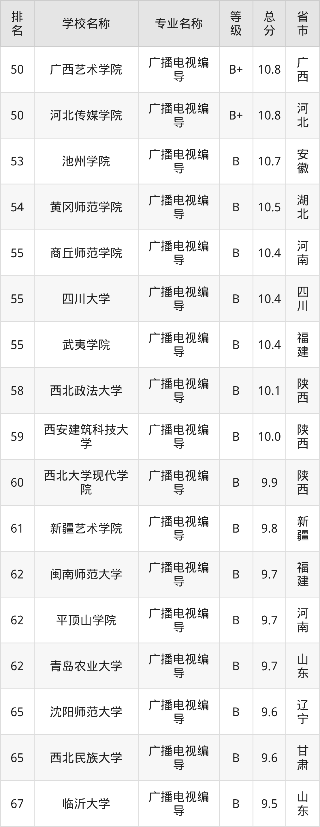 根据软科榜单可知,广播电视编导专业全国排名前十的大学分别是: