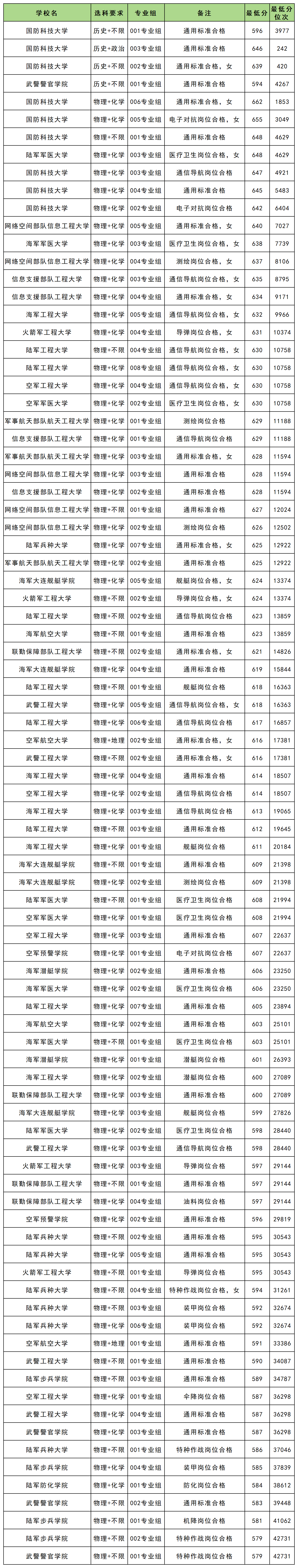 军校分数线在650分以上的包括:国防科技大学005专业组655分,位次排名3049;国防科技大学006专业组662分,位次排名1853。