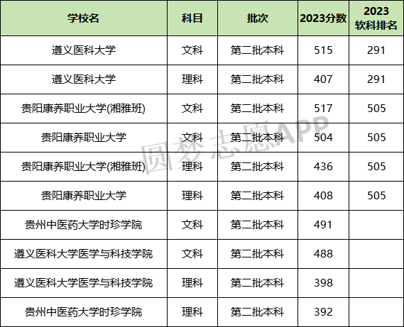 下表为2023年贵州省各二本医科大学的排名和录取分数