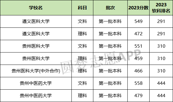 下表为2023年贵州省各一本医科大学的排名和录取分数,各位可以在圆梦志愿app测评被贵州各大学的录取概率。