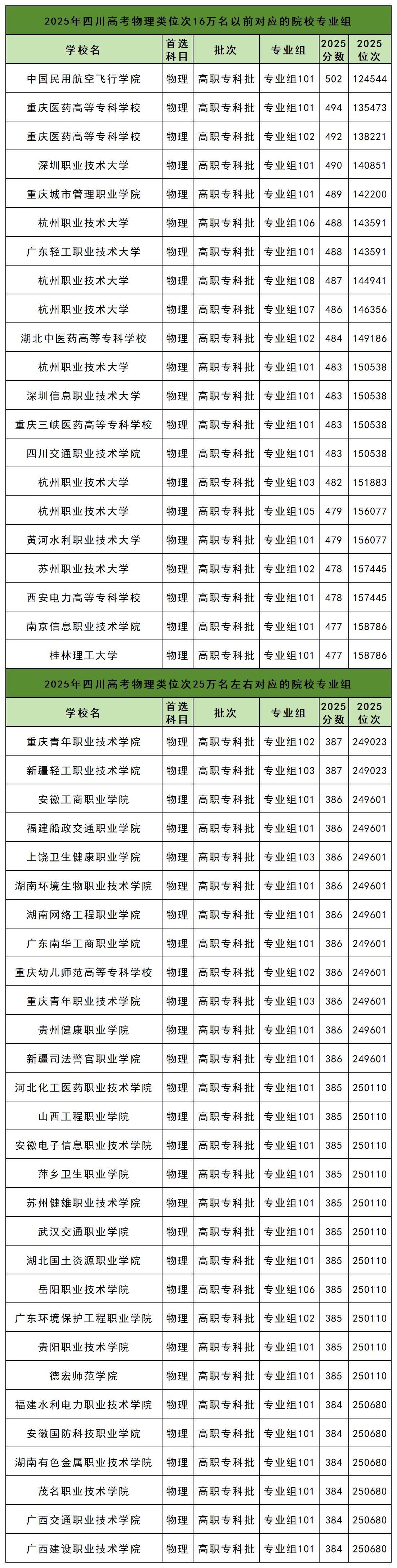 物理类位次排名16万名以前对应的大学专业组有21个,分数线在477分到502分不等。其中分数线最高的是中国民用航空飞行学院101组,2025年最低录取位次为124544名。分数线最低的院校是南京信息职业技术学院101组和桂林理工大学101组,2025年最低录取位次为158786名。
