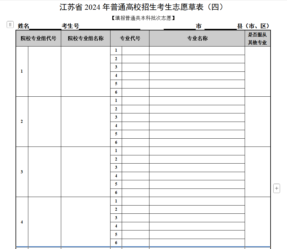其中本科批、高职专科批采用40个院校专业组志愿,每个组内含6个专业志愿及1个是否服从专业调剂选项。新高考省份志愿样表基本不会有变化,下面附上2024年高考志愿填报样表,可供2025届考生参考: