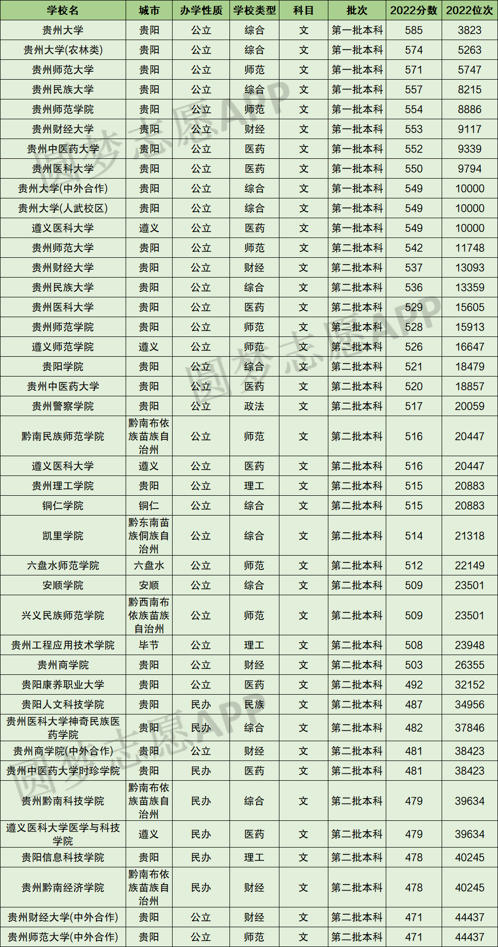 贵州文科中分数最高的本科大学分别为贵州大学、贵州大学(农林类)、贵州师范大学、贵州民族大学、贵州师范学院、贵州财经大学、贵州中医药大学、贵州医科大学、贵州大学(中外合作)、贵州大学(人武校区)。对应分数区间为585分-549分,对应全省位次为3823-10000。