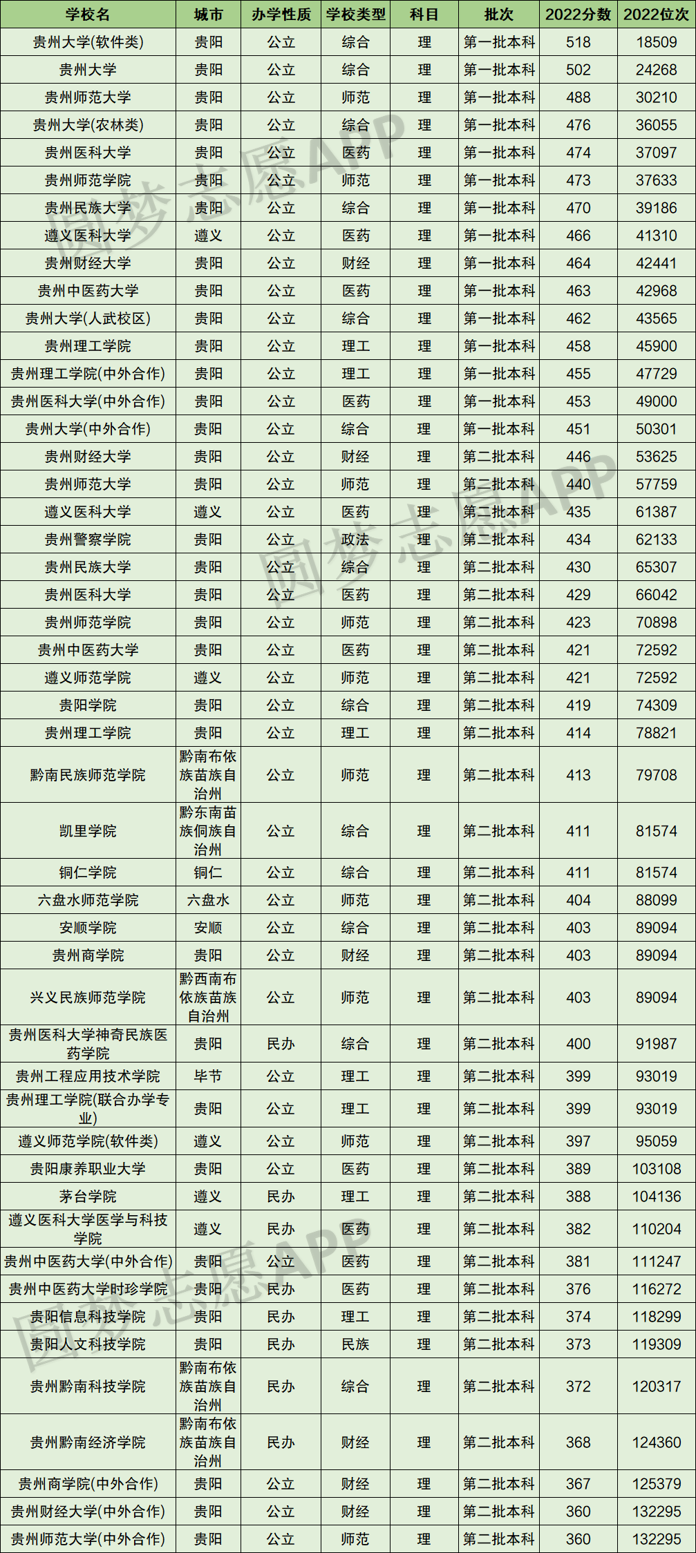 贵州理科中分数最高的本科大学分别为贵州大学(软件类)、贵州大学、贵州师范大学、贵州大学(农林类)、贵州医科大学、贵州师范学院、贵州民族大学、遵义医科大学、贵州财经大学、贵州中医药大学。对应分数区间为518分-463分,对应全省位次为18509-42968。