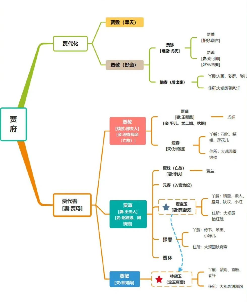贾府是由宁国公贾演的下一代贾代化的家族(宁国府),和荣国公贾源的后代贾代善的家族(荣国府)两个大家庭组成