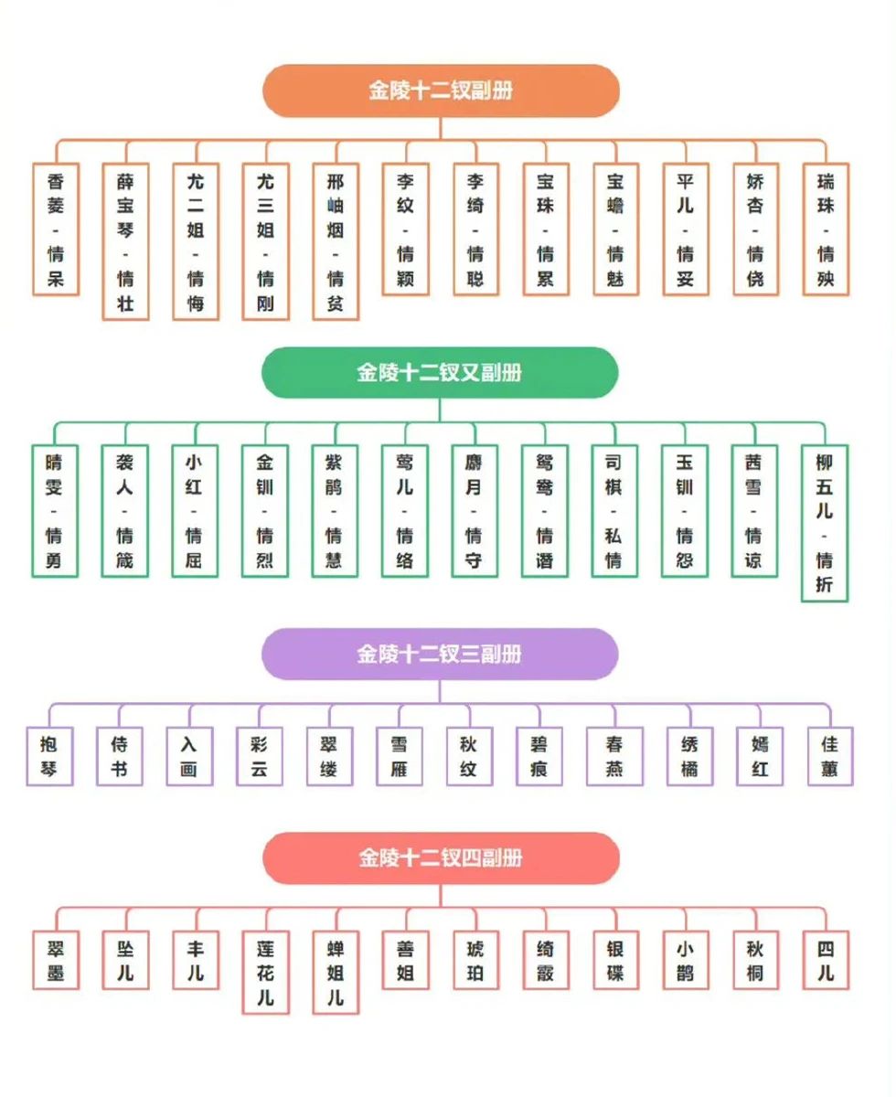 金陵十二钗,是中国古典小说《红楼梦》中最优秀的十二位女孩。金陵是一个省,也是剧情的核心发生地,“钗”指女儿,太虚幻境薄命司以十二为一组将贾府上、中、下三等女子编成正、副、又副三册”。警幻仙子道:“即贵省中十二冠首女子之册,故为“正册”,“(副、又副)下橱则又次之”。第五回完整出示了林黛玉、薛宝钗、贾元春、贾探春、史湘云、妙玉、贾迎春、贾惜春、王熙凤、贾巧姐、李纨、秦可卿十二位正册女性名单。