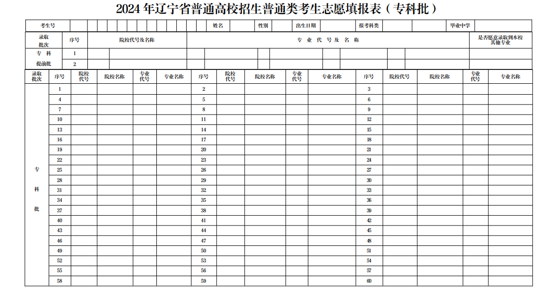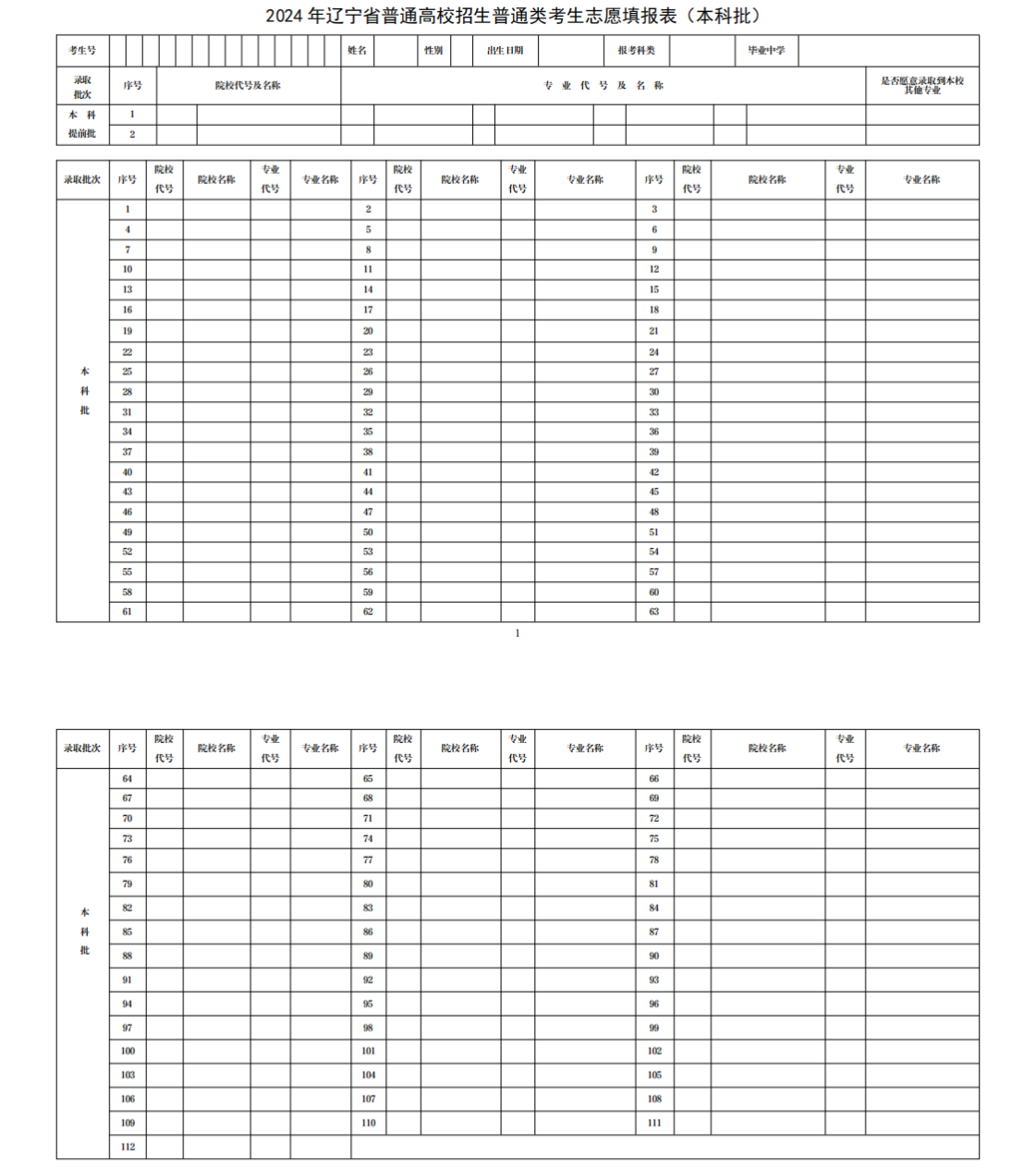 这里附上2024年辽宁省新高考普通类本科批和普通类专科批志愿表范本,以供2025届考生参考: