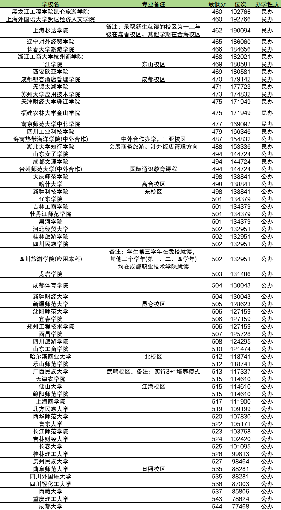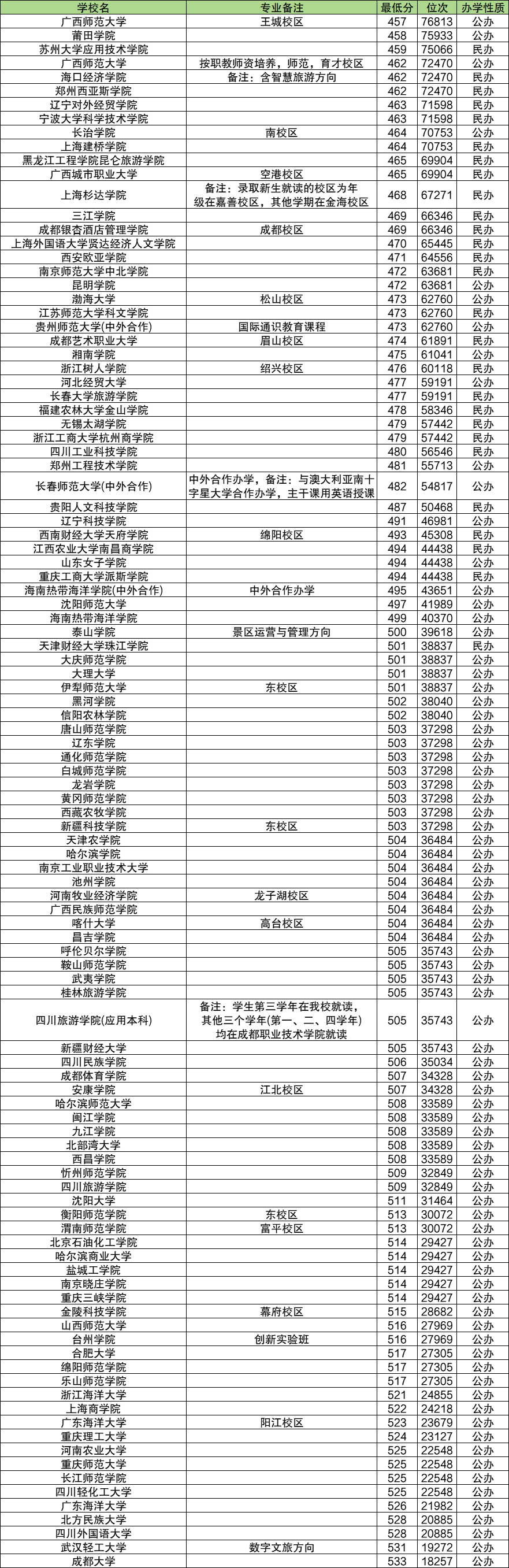 三、二本旅游管理录取分数线