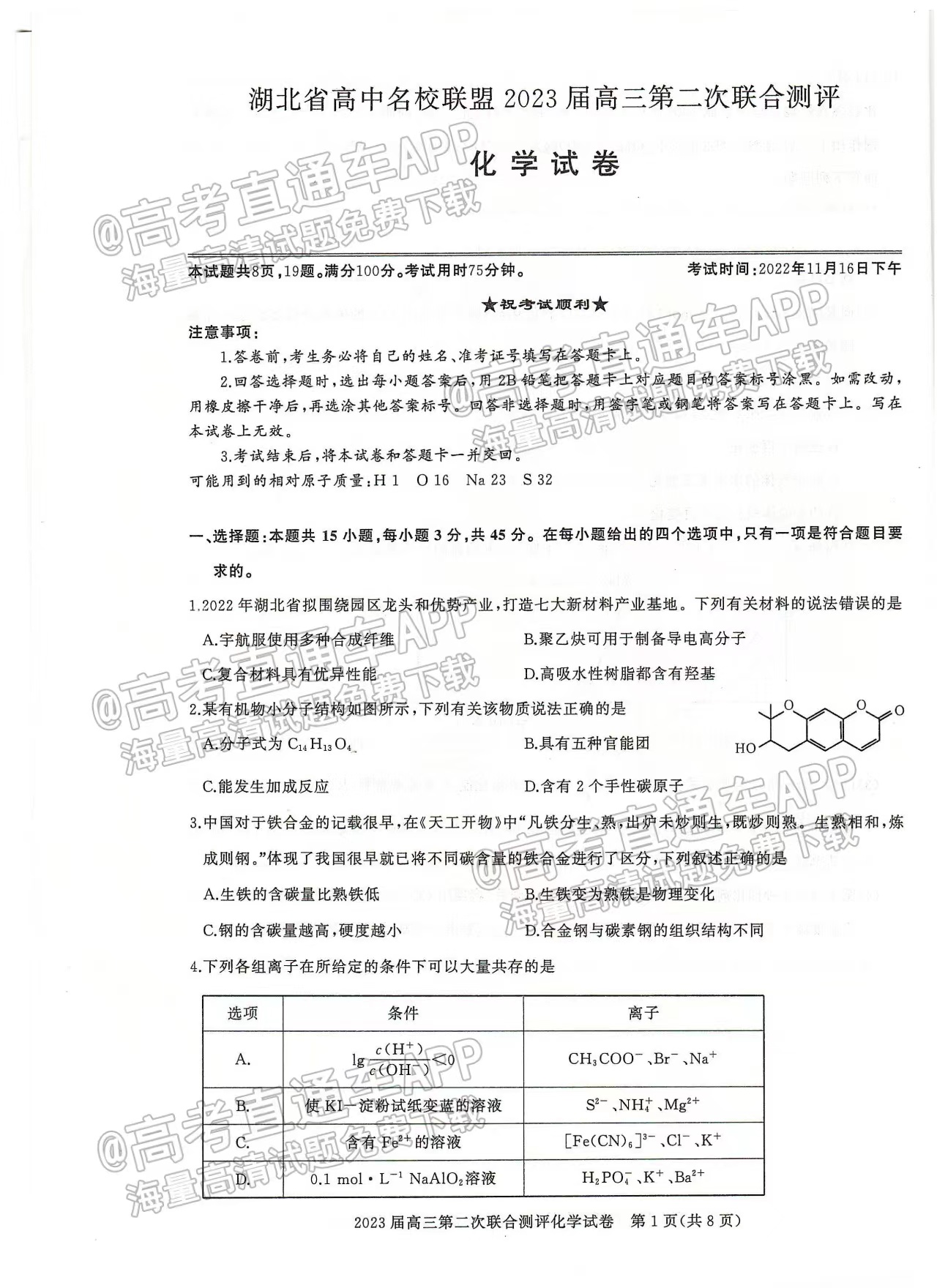 1.2023湖北圆创联盟高三11月联考化学试卷