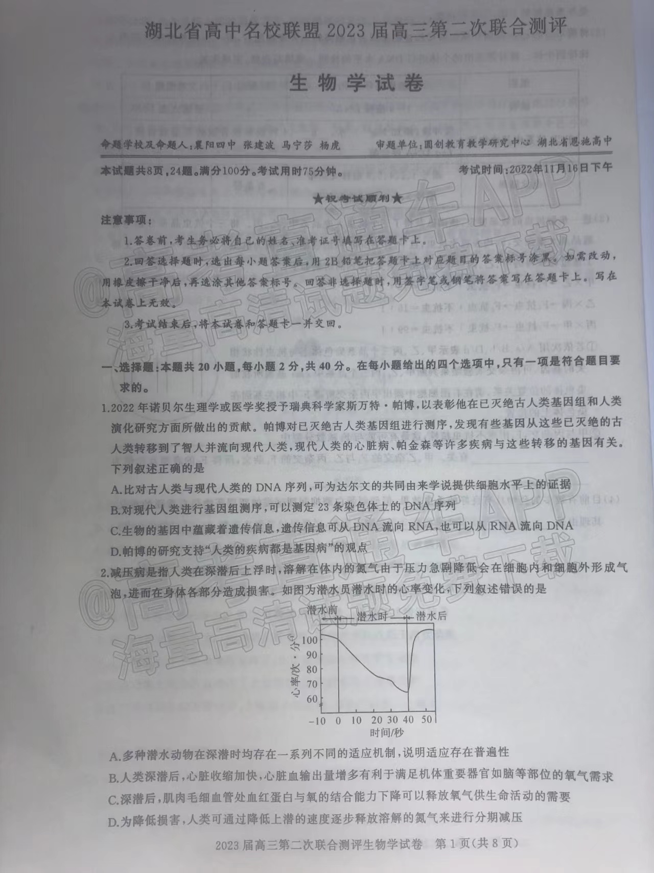 1.2023湖北圆创联盟高三11月联考生物试卷