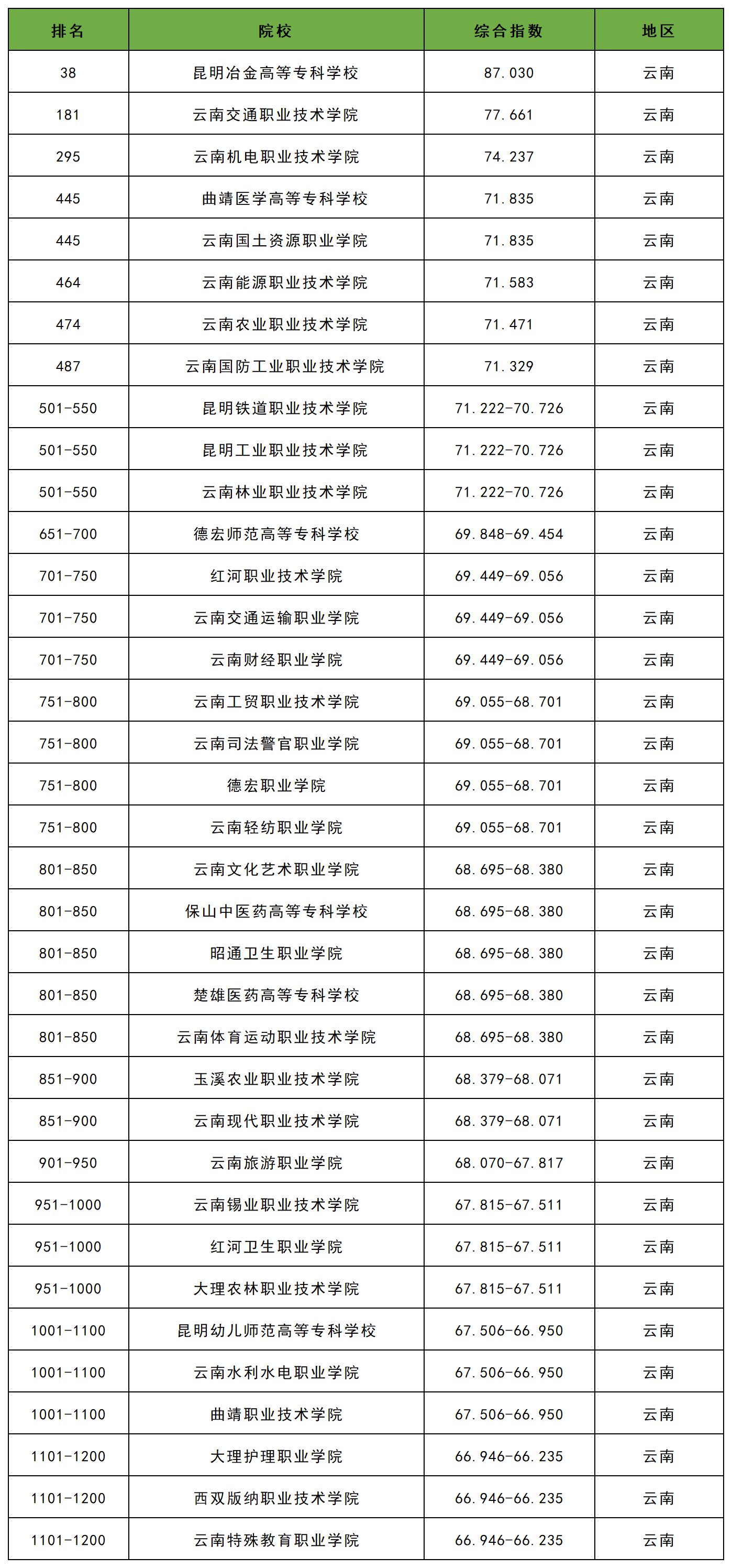 2025年GDI云南省公办专科大学排名前五大学如下: