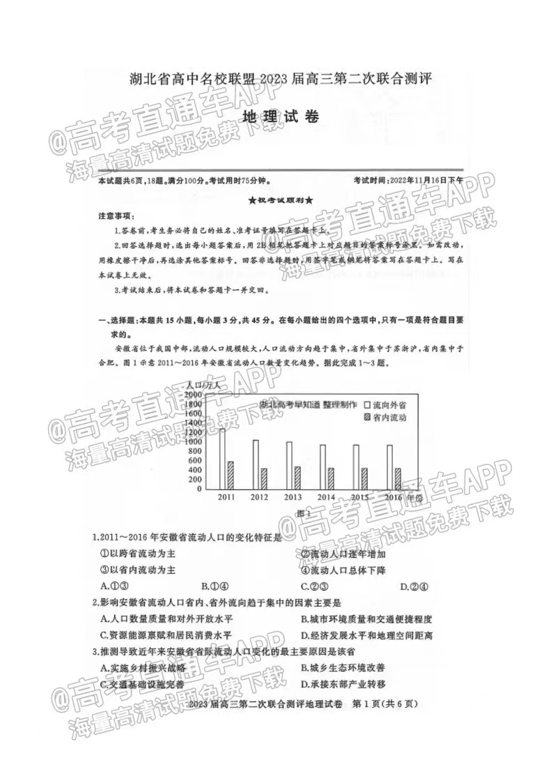 一.2023湖北圆创联盟高三11月联考地理试卷及答案详情汇总