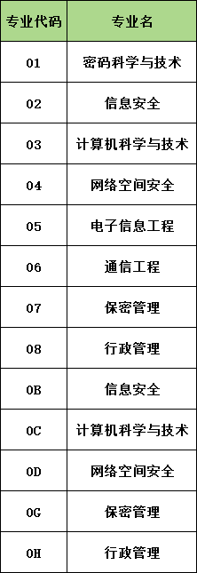 全国各大学在山东招生的专业代码各不相同,一般而言,专业代码为2位数,同一专业不同专业方向的代码也会有差异。以北京电子科技学院为例,密码科学与技术专业代码是01、信息安全专业代码是02、计算机科学与技术专业代码是03等。篇幅有限,这里仅列举北京电子科技学院的本科志愿填报专业代码,以供参考: