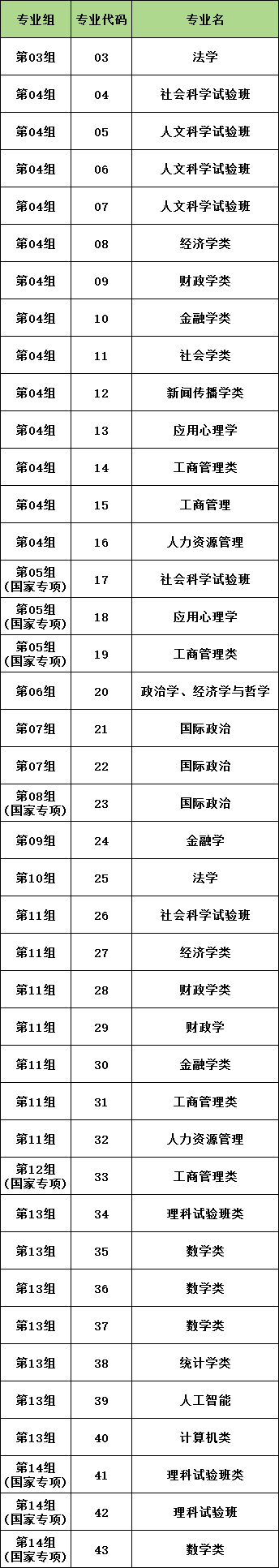 全国各大学在湖北招生的专业代码各不相同,一般而言,专业代码为2位数,同一专业不同专业方向的代码也会有差异。以中国人民大学为例,第04专业组经济学类专业代码是08、财政学类专业代码是09、金融学类专业代码是10等。篇幅有限,这里仅列举中国人民大学的本科志愿填报专业代码,以供参考:
