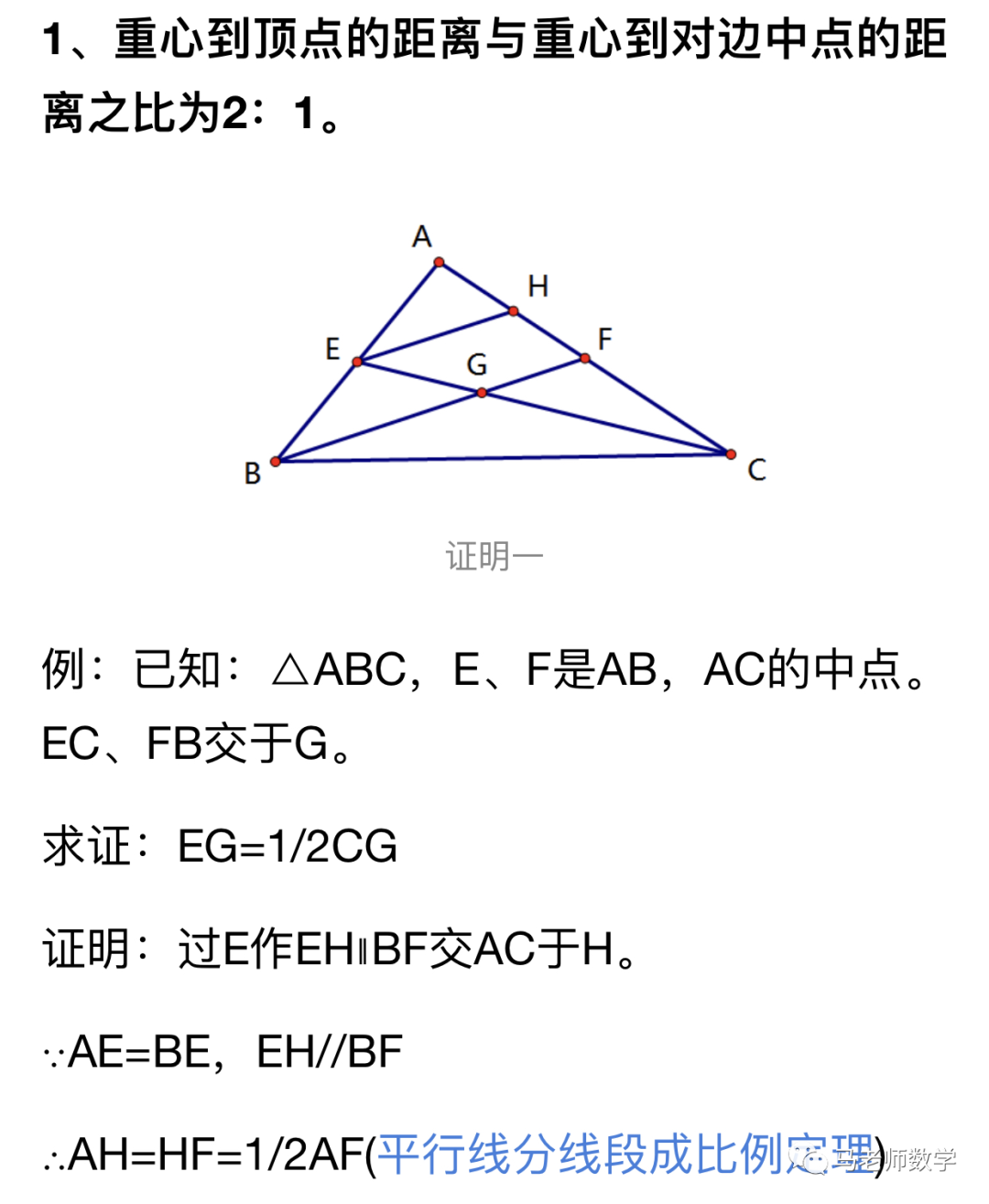 (1) 三角形的重心到边的中心与到相应顶点的距离之比为1:2。