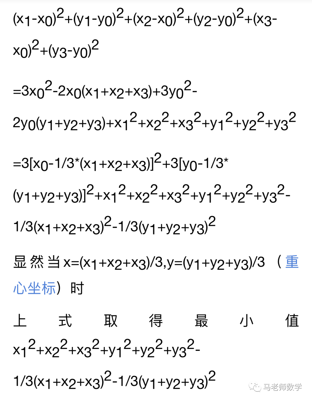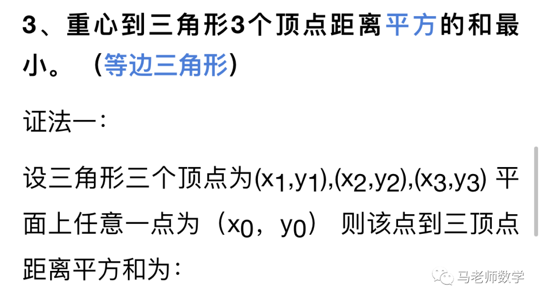 (3)重心到三角形三个顶点距离的平方和最小(等边三角形)。