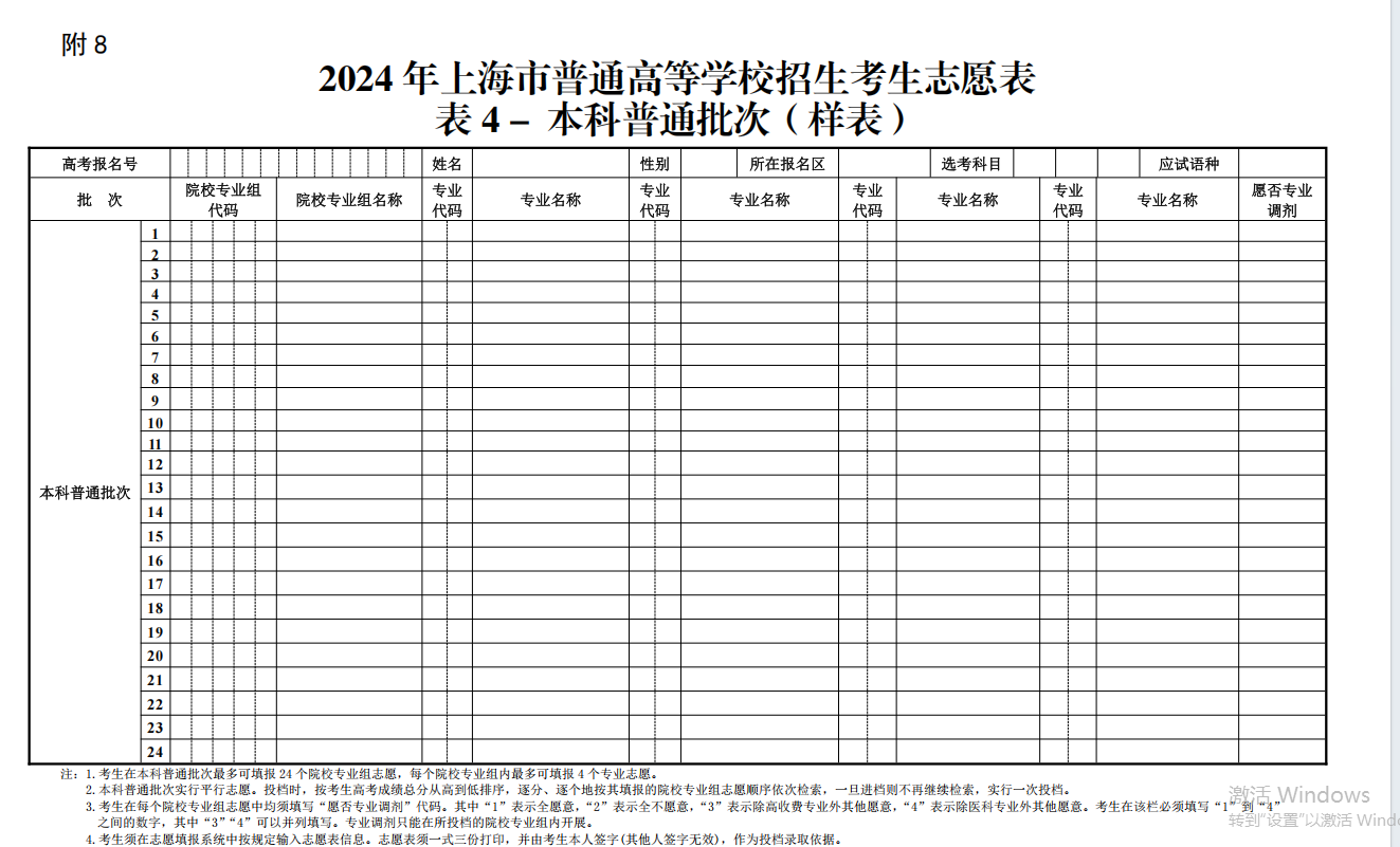 其中本科批、高职专科批采用24个院校专业组志愿,每个志愿内含4个专业志愿及1个是否服从专业调剂选项。新高考省份志愿样表基本不会有变化,下面附上2024年高考志愿填报样表,可供2025届考生参考: