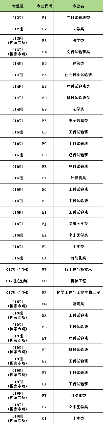全国各大学在甘肃招生的专业代码各不相同,一般而言,专业代码为2位数,同一专业不同专业方向的代码也会有差异。以清华大学为例,第016专业组临床医学类专业代码是BK、土木类专业代码是BL、自动化类专业代码是BM等。篇幅有限,这里仅列举清华大学的本科志愿填报专业代码,以供参考: