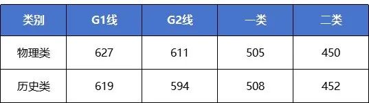 物理类:一类线(本一)505分、二类线(本科)450分、G1线(985线)627分、G2线(211线)611分;