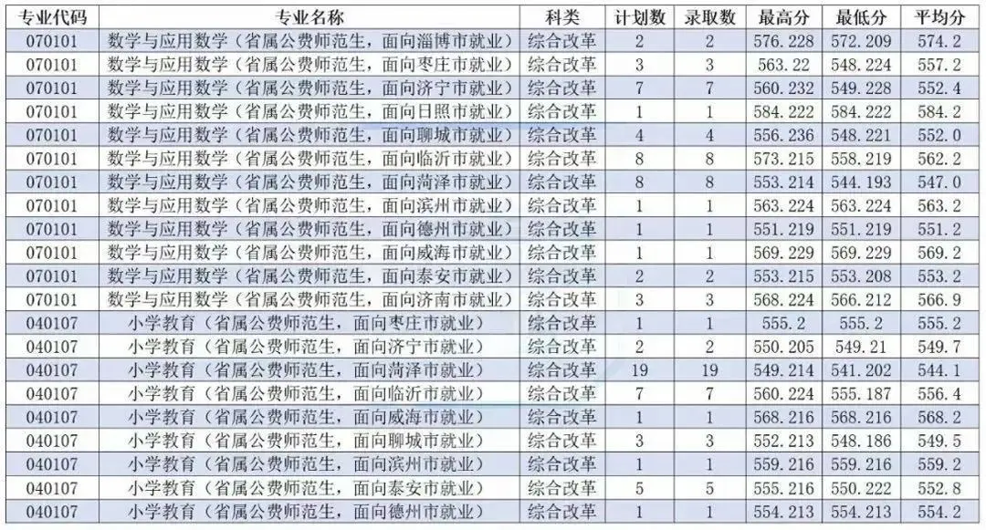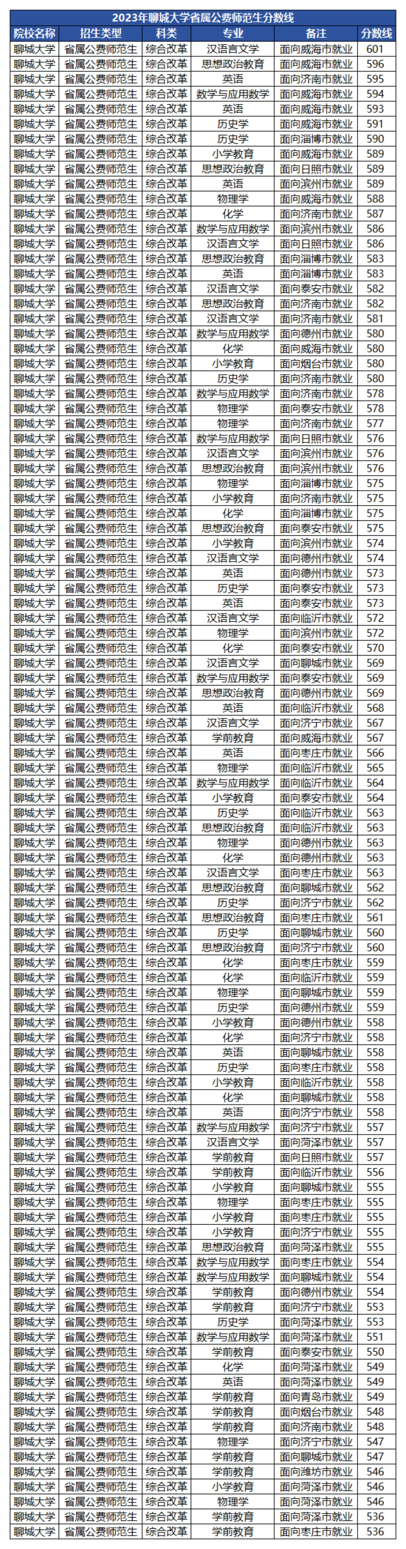 2023年聊城大学公费师范生专业最高分601分、录取最低分536分;平均分566分,超出普通类一段线123分。