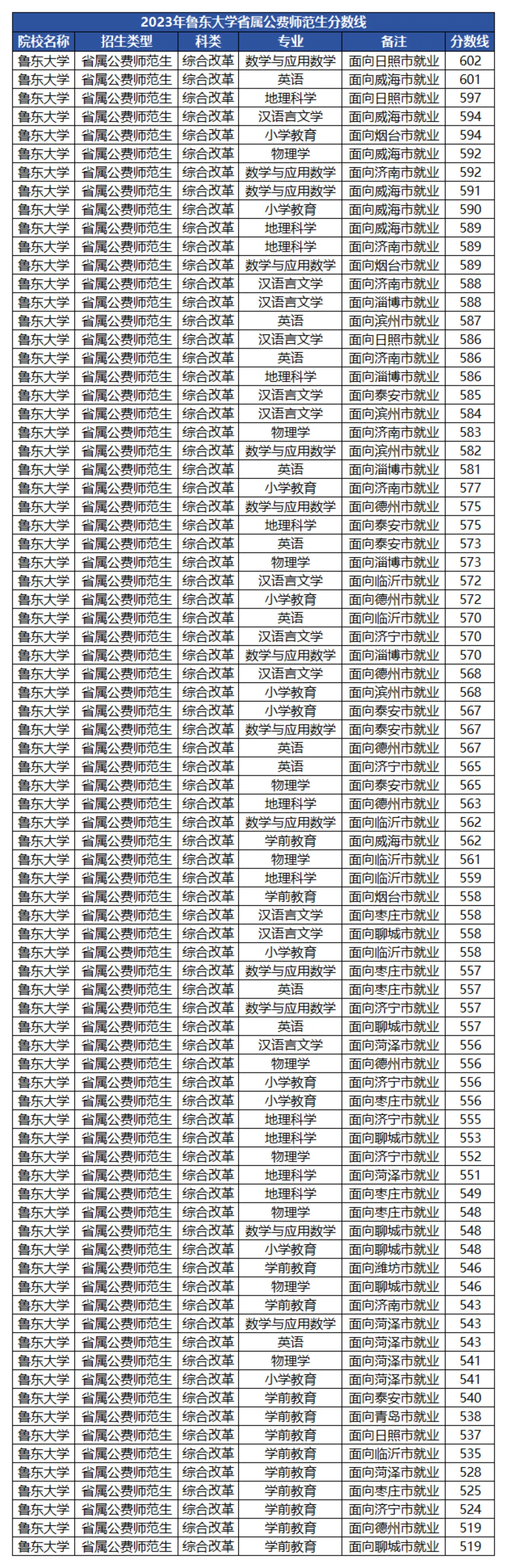 2023鲁东大学公费师范生分专业录取分数线一览表: