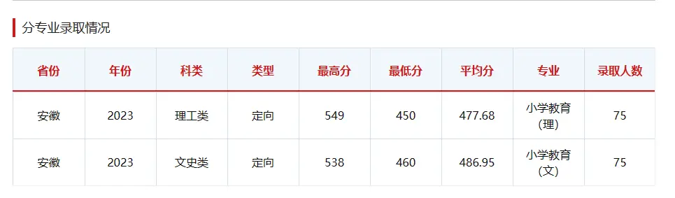 2023年淮南师范学院面向理科考生招录的小学教育(公费师范生)专业录取最低分为447分,而面向文科考生招生最低分为457分。同样也非常适合高考450分左右的文理科考生重点关注。