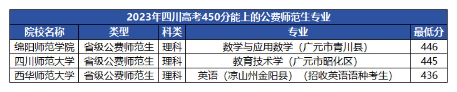 2023年四川理科高考450分的考生同样可以报考3所师范大学的公费师范生专业,这3所院校分别是绵阳师范学院、四川师范大学和西华师范大学,录取最低分数线分别是446分、445分和436分。