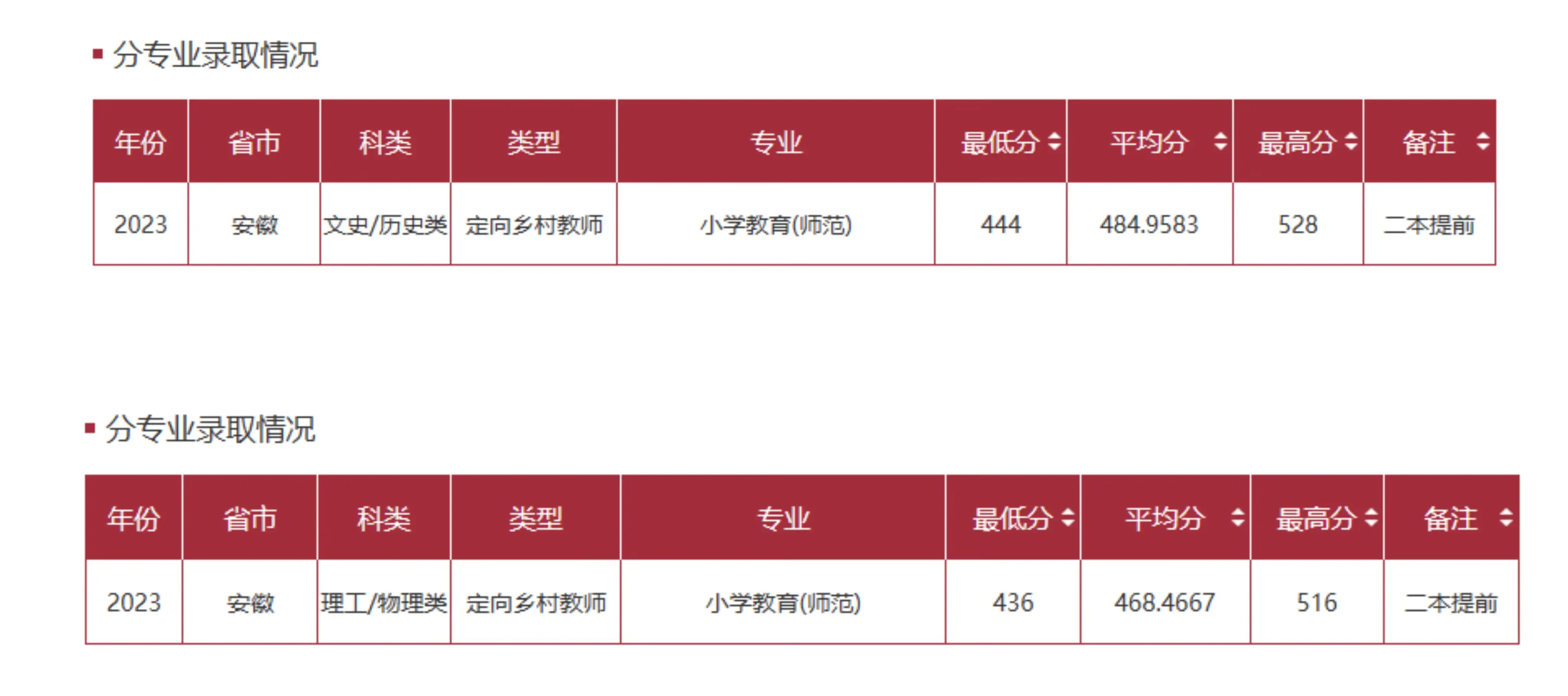 2023年淮北师范大学在面向安徽文理科考生招收小学教育(公费师范)专业最低分为文科444分、理科436分,均低于450分录取。推荐安徽文理科高考450分左右的考生报考。
