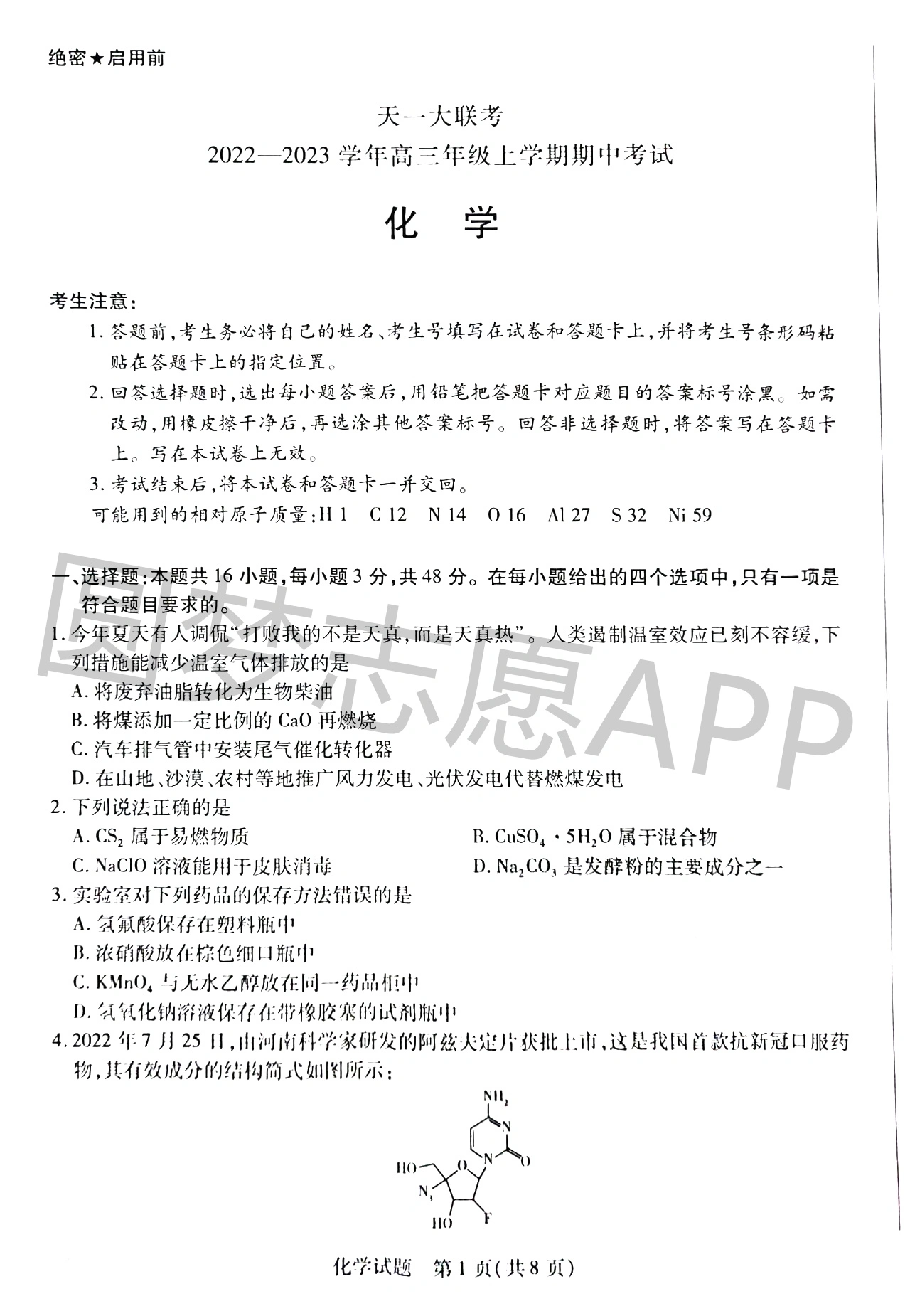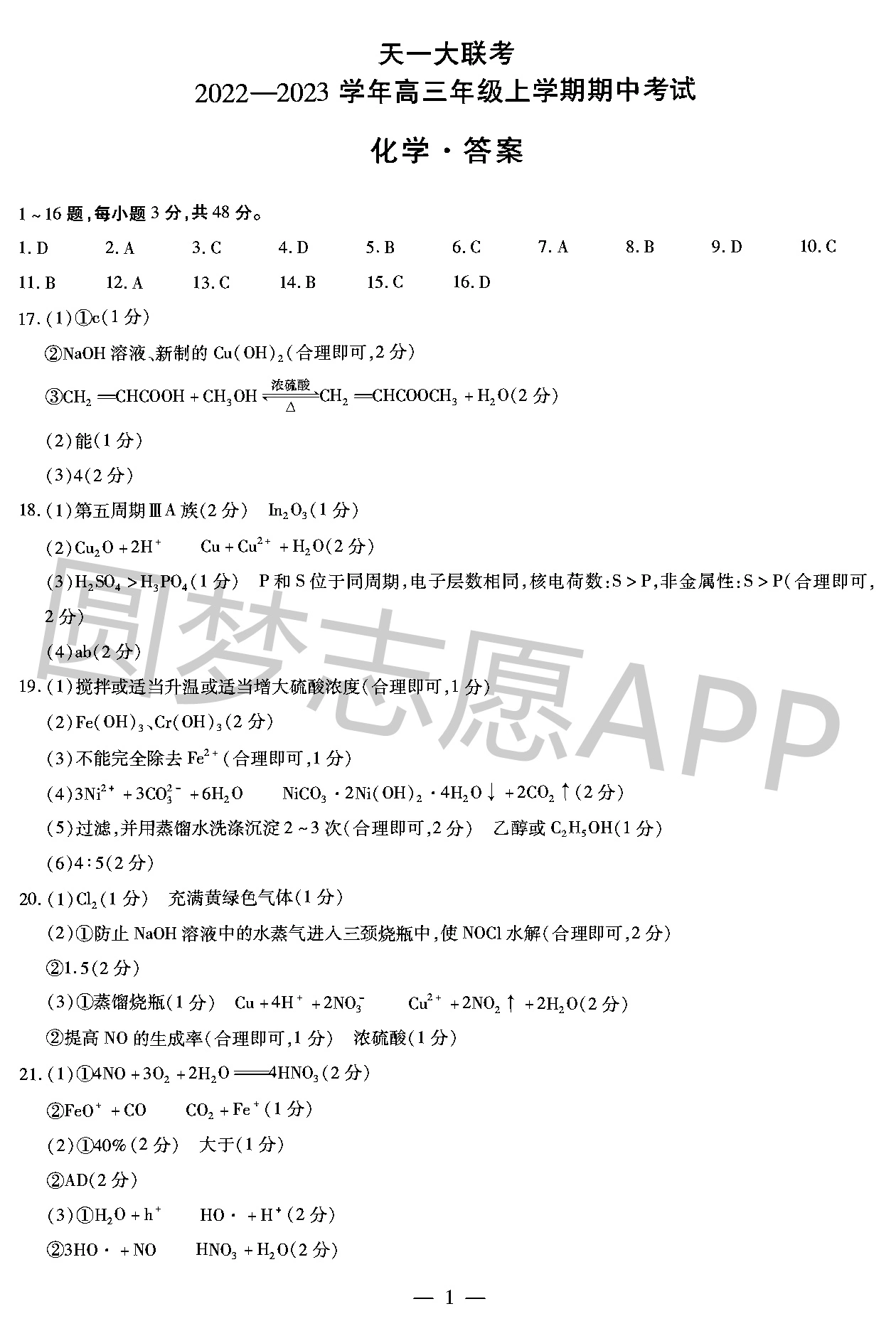 2023天一大联考高三期中考试将于2022年11月14日开考,考试结束后本文将更新2023天一大联考高三期中考试化学答案及试卷,下文为高考100网小编搜集整理的2023天一大联考高三期中考试化学试题及参考答案,供大家参考。