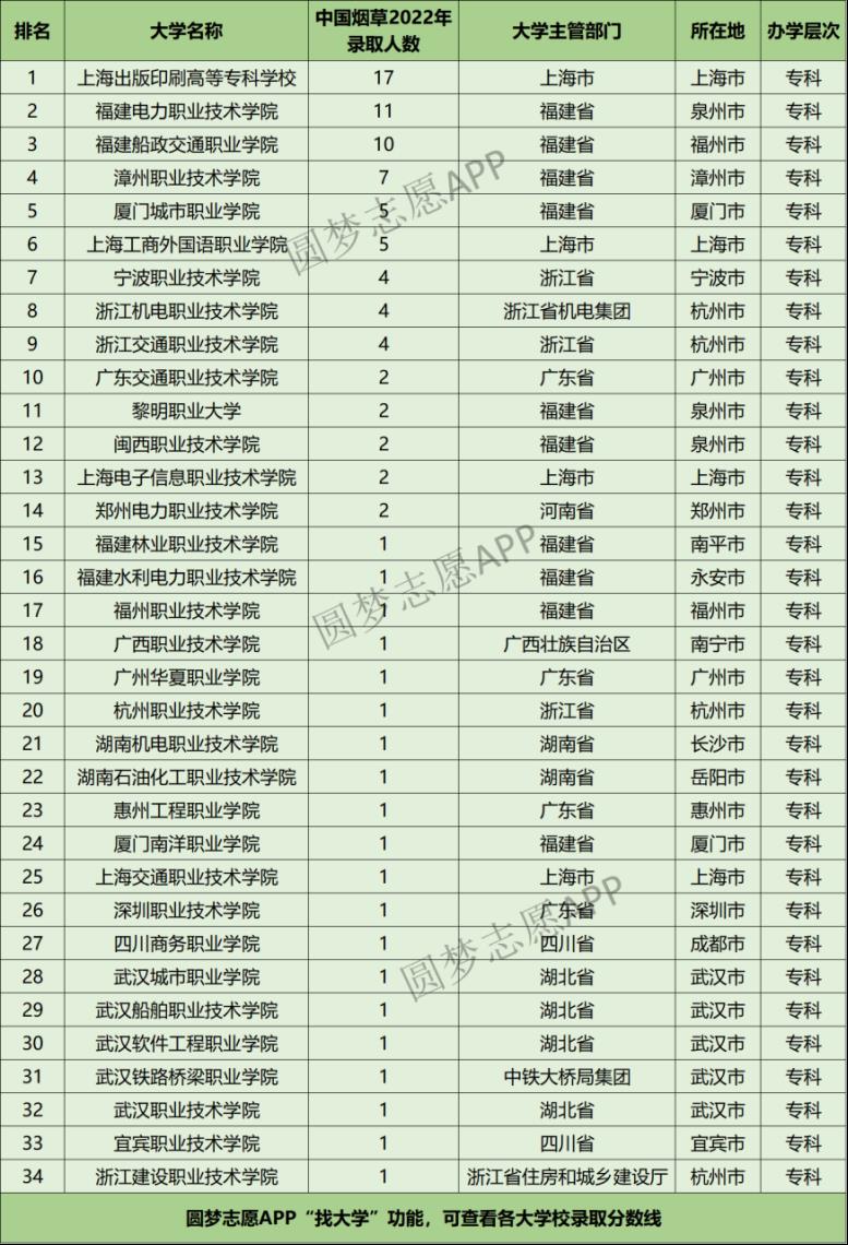 圆梦志愿为大家整理出了:中国烟草2022年在全国专科学校的录用情况,共涉及34所专科大学,录用97人,具体名单及人数排名如下图。