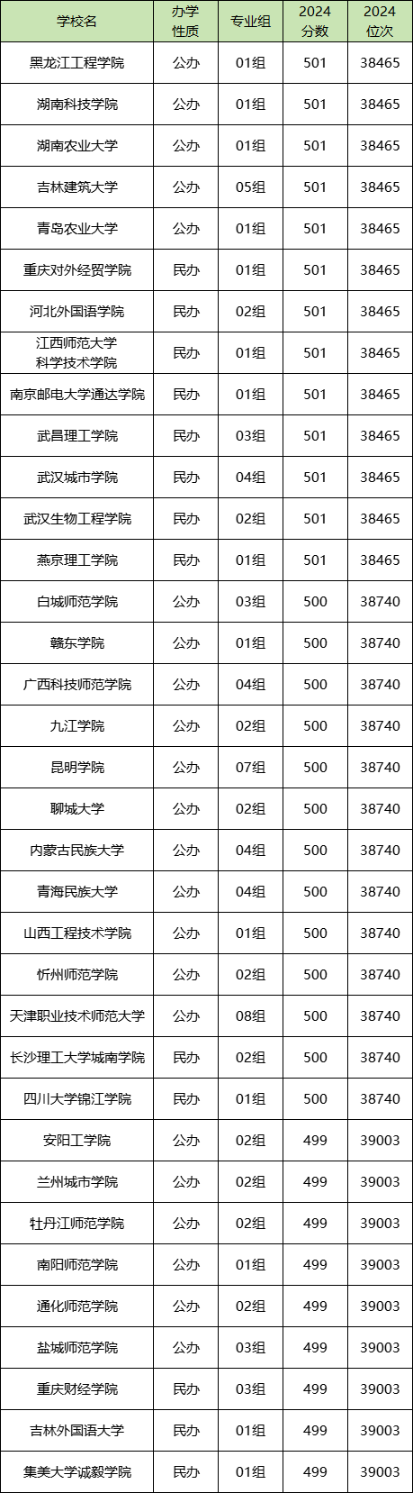 其中比较推荐大家报考的院校专业组有湖南农业大学01组(501分)、吉林建筑大学05组(501分)、内蒙古民族大学04组(500分)、吉林外国语大学01组(499分)等省重点院校。