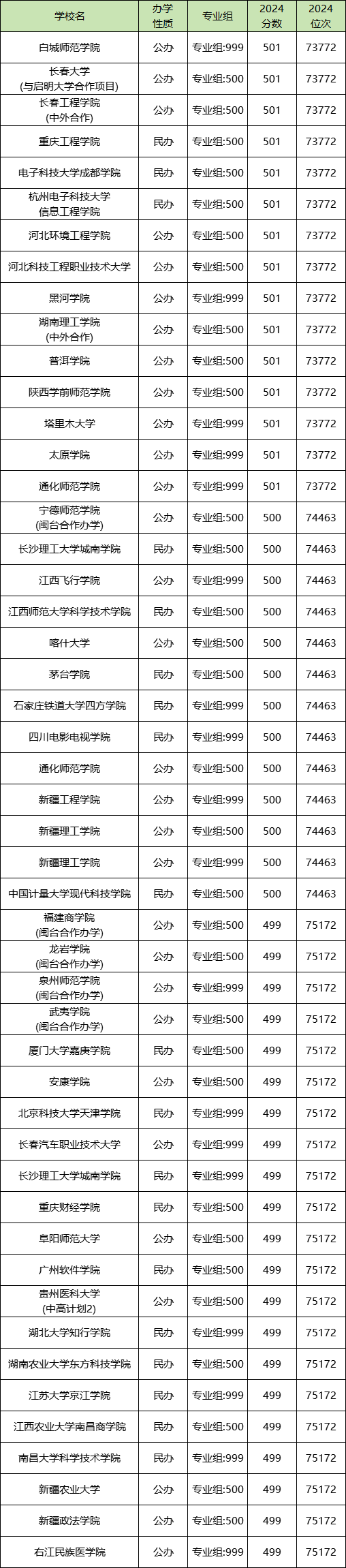 2024年福建物化政500分左右能上白城师范学院999组(501分)、江西飞行学院999组(500分)、新疆政法学院500组(499分)等院校专业组。