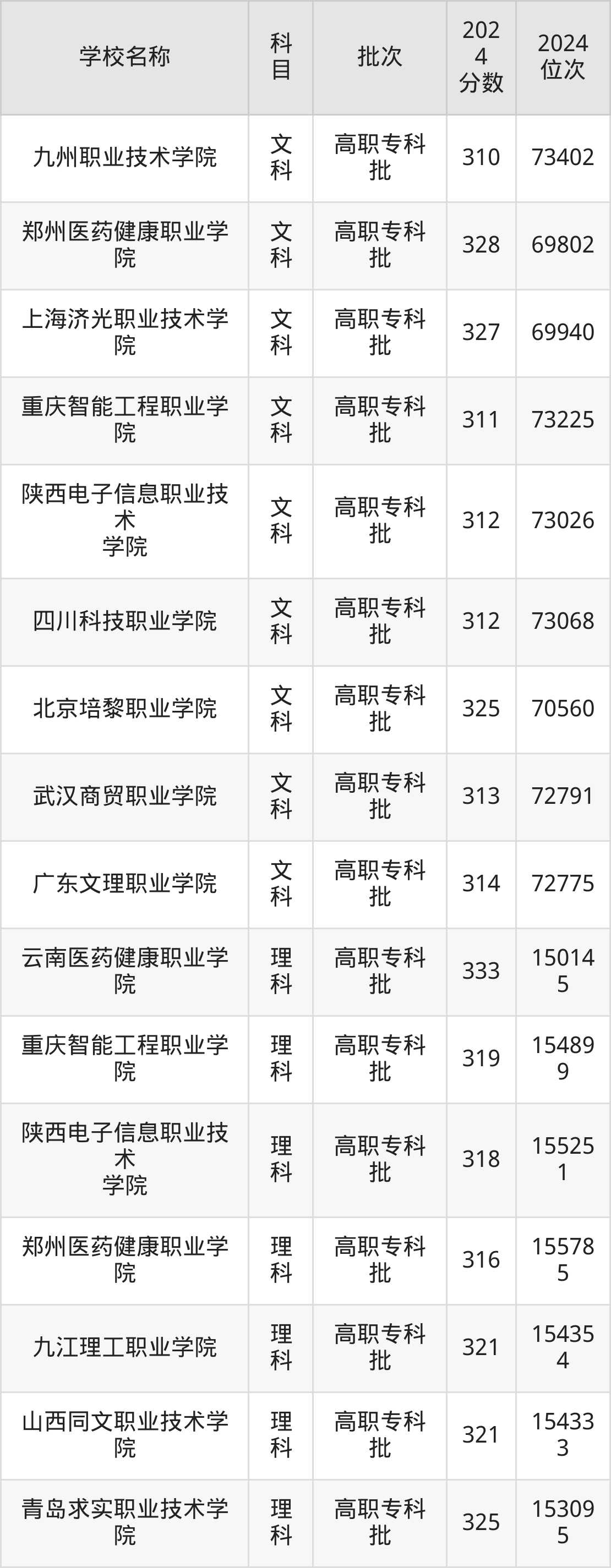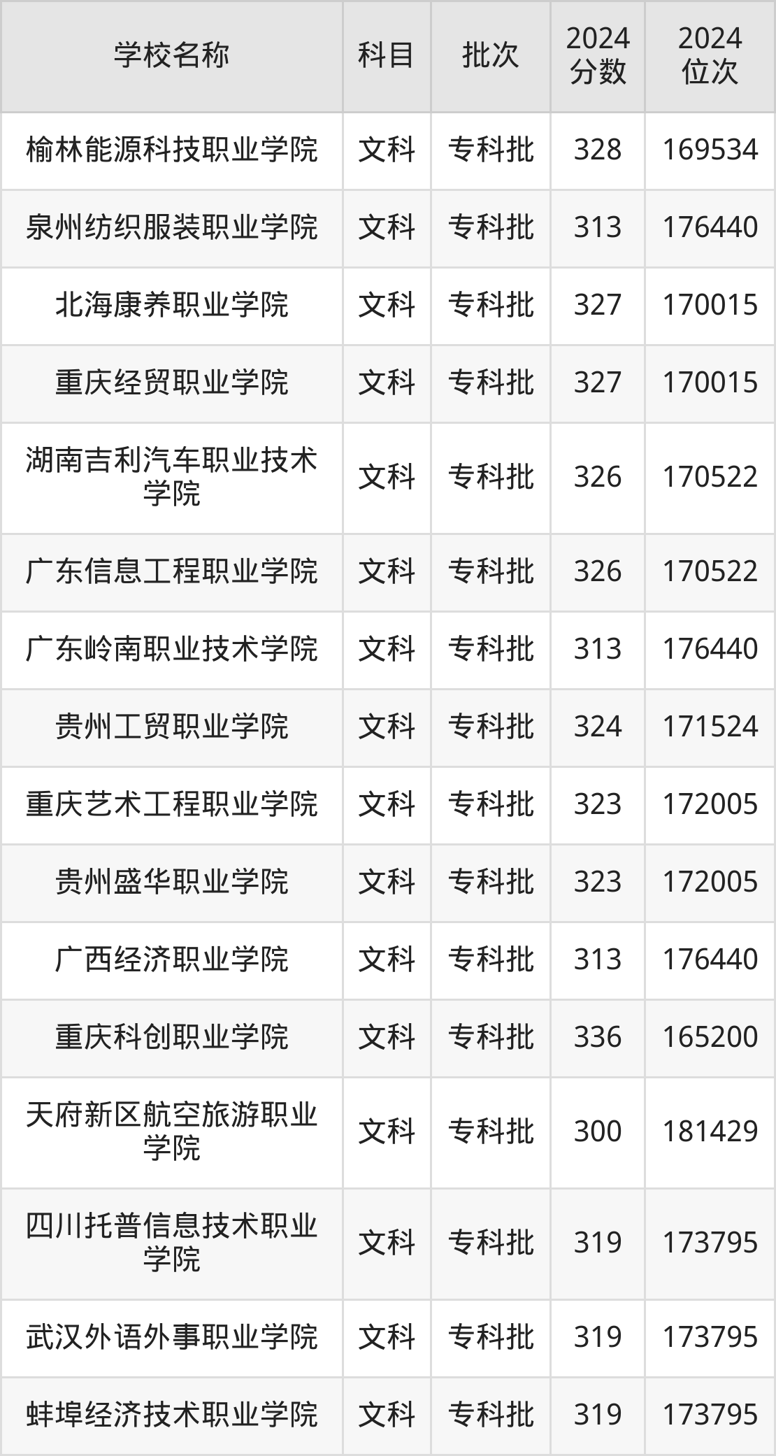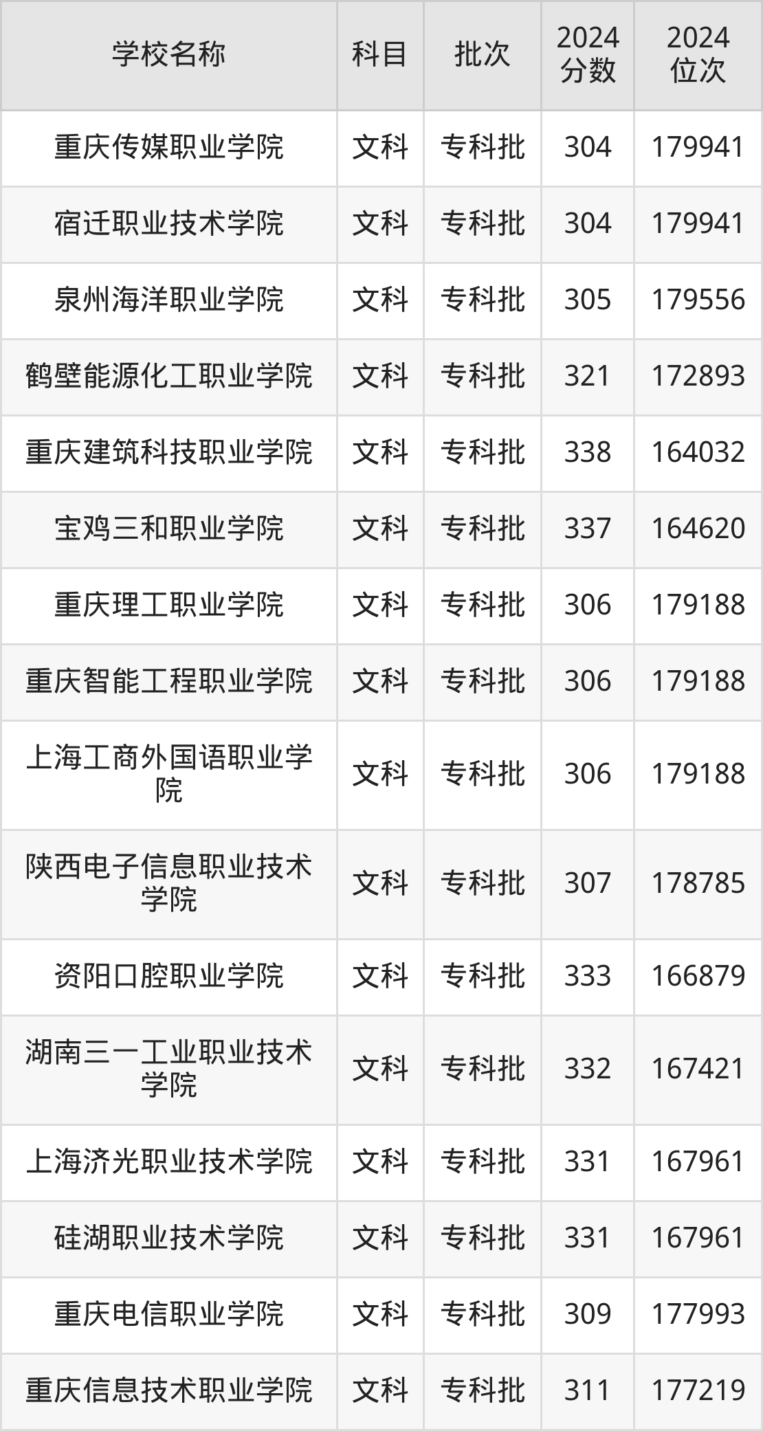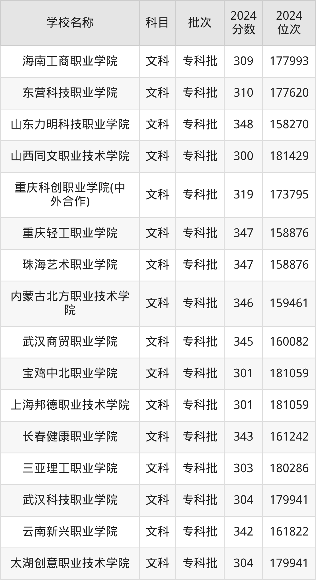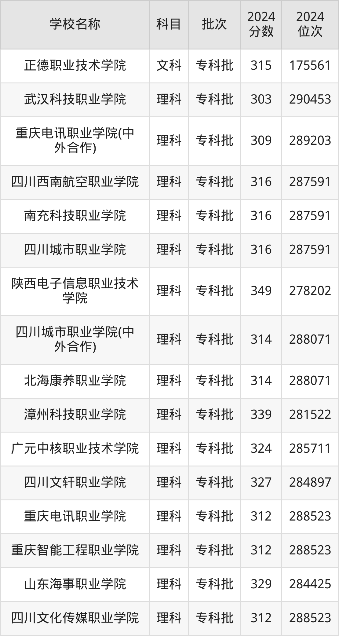 四川高考文科共有49所民办专科学校在300到350分之间录取,包含山东力明科技职业学院、重庆轻工职业学院、珠海艺术职业学院、内蒙古北方职业技术学院、武汉商贸职业学院、长春健康职业学院、云南新兴职业学院、重庆建筑科技职业学院、宝鸡三和职业学院、重庆科创职业学院。