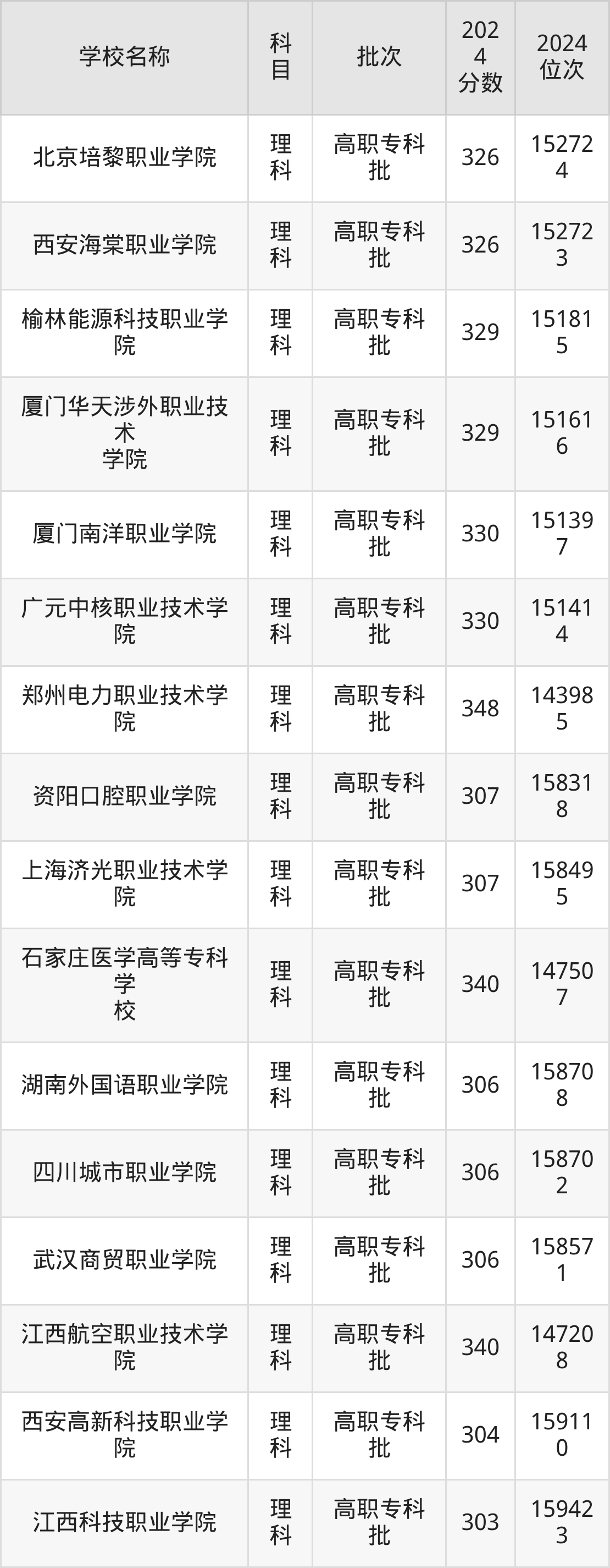 陕西高考理科共有25所民办专科学校在300到350分之间录取,包含郑州电力职业技术学院、昆明卫生职业学院、江西航空职业技术学院、石家庄医学高等专科学校、云南医药健康职业学院、广元中核职业技术学院、厦门南洋职业学院、厦门华天涉外职业技术学院、榆林能源科技职业学院、西安海棠职业学院。