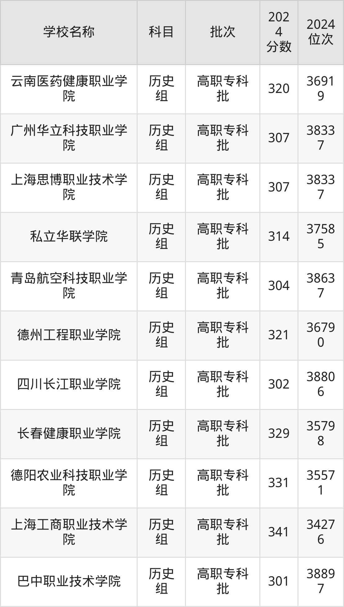 辽宁高考历史组共有15所民办专科学校在300到350分之间录取,包含上海工商职业技术学院、德阳农业科技职业学院、长春健康职业学院、德州工程职业学院、云南医药健康职业学院、四川现代职业学院、长春信息技术职业学院、黑龙江三江美术职业学院、私立华联学院、眉山药科职业学院。