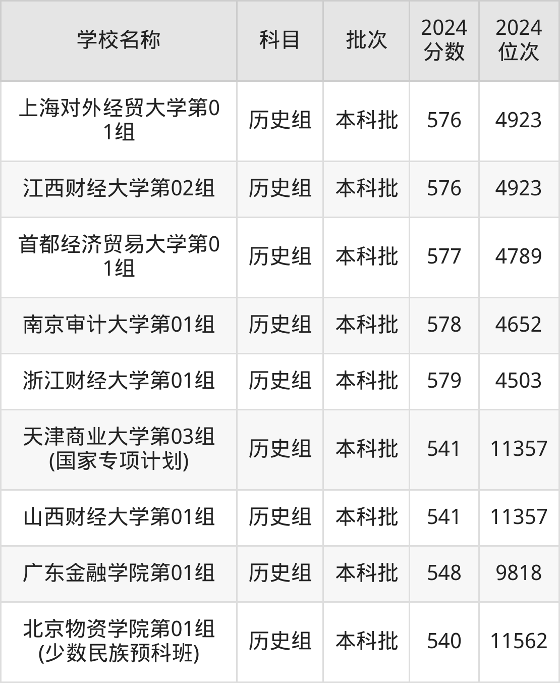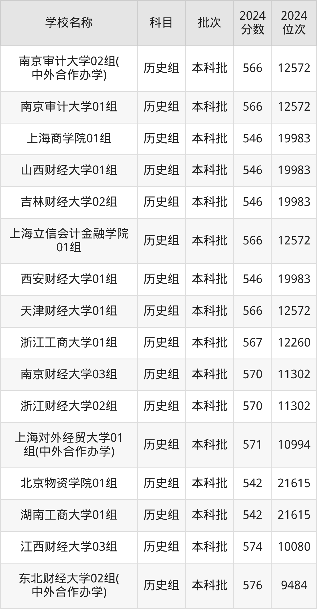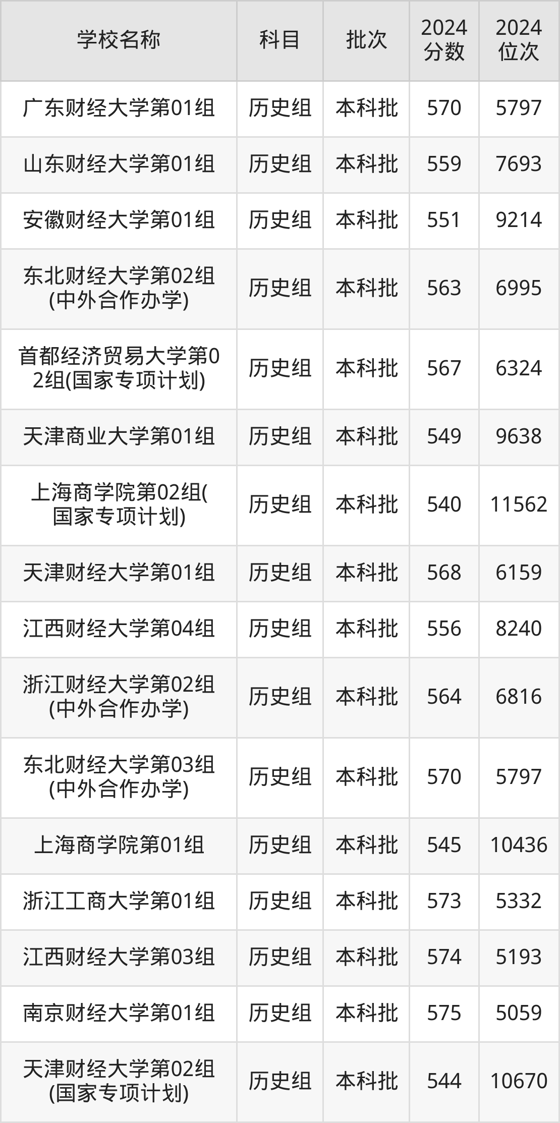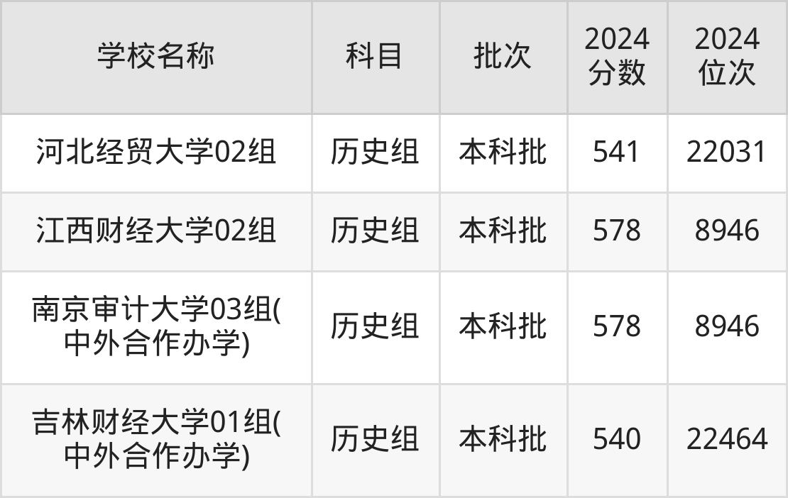 江苏高考历史组共有24所财经大学在540到580分之间录取,包含南京审计大学、江西财经大学、东北财经大学、广东财经大学、上海对外经贸大学、浙江财经大学、南京财经大学、浙江工商大学、天津财经大学、上海立信会计金融学院。