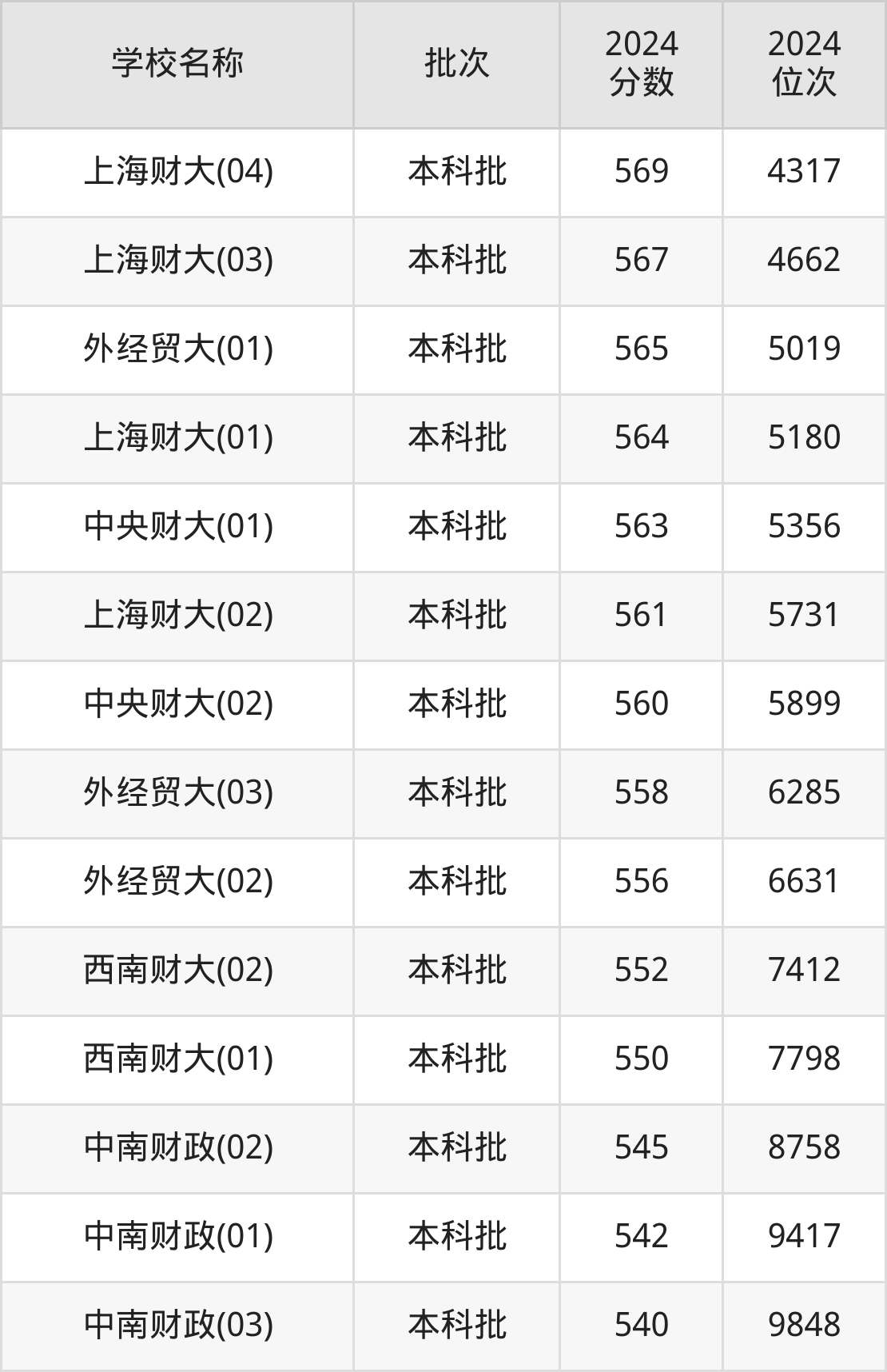 上海高考共有5所财经大学在540到580分之间录取,包含上海财经大学、对外经济贸易大学、中央财经大学、西南财经大学、中南财经政法大学。