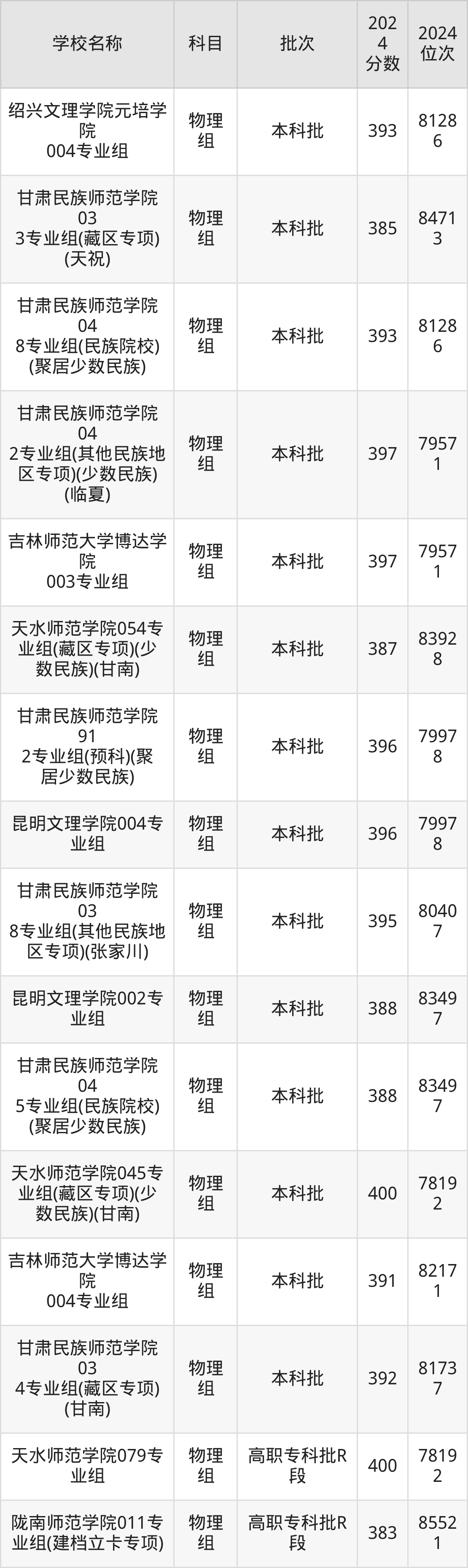 甘肃高考物理组共有6所二本师范大学在380到400分之间录取,包含天水师范学院、甘肃民族师范学院、吉林师范大学博达学院、昆明文理学院、绍兴文理学院元培学院、陇南师范学院。