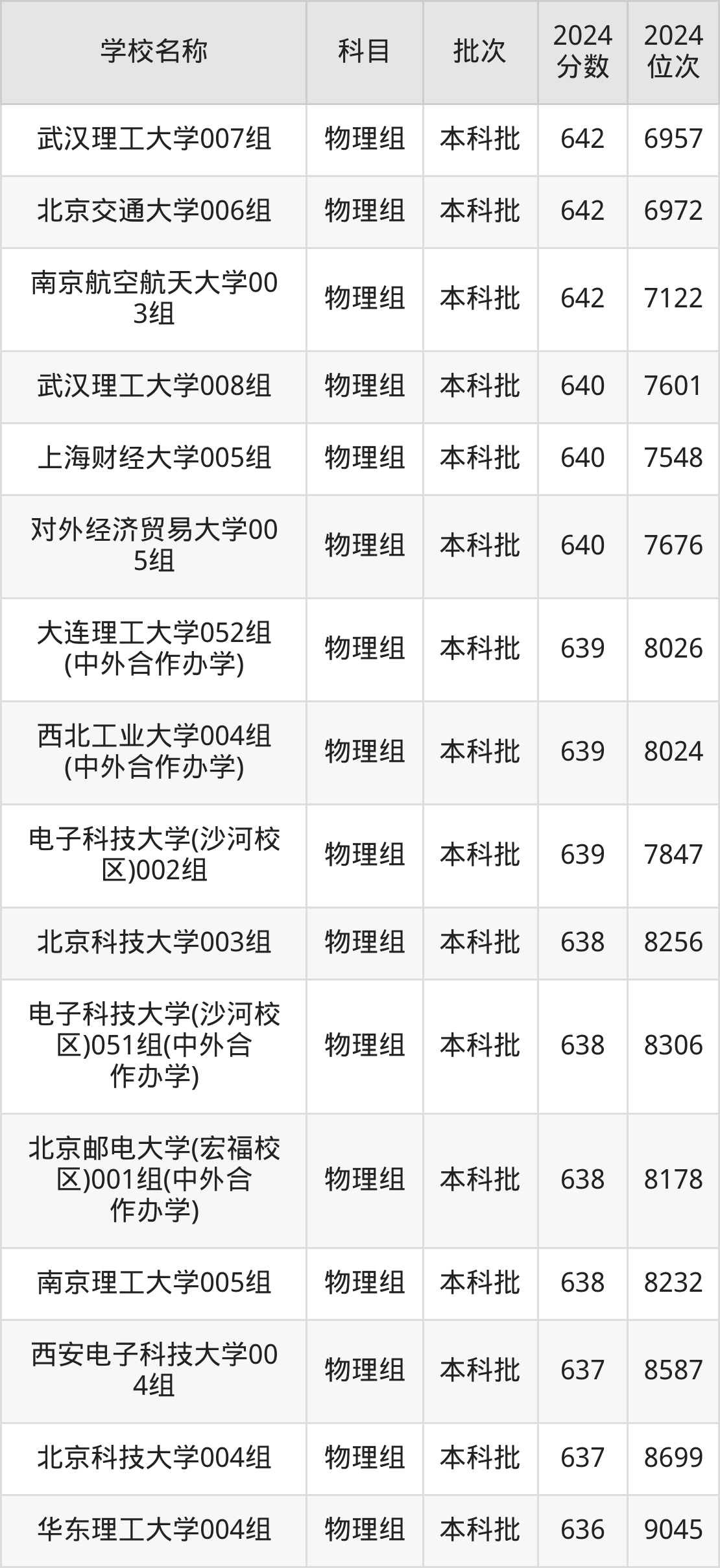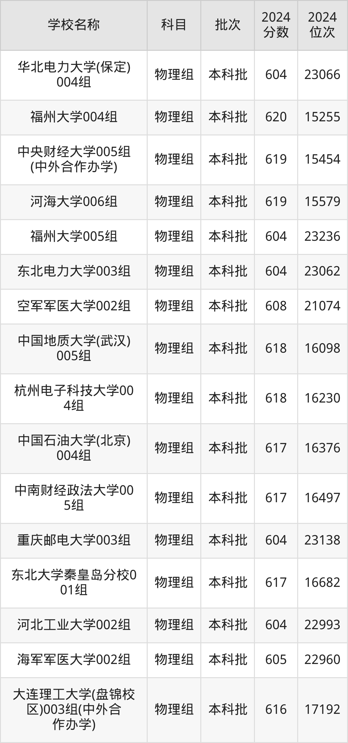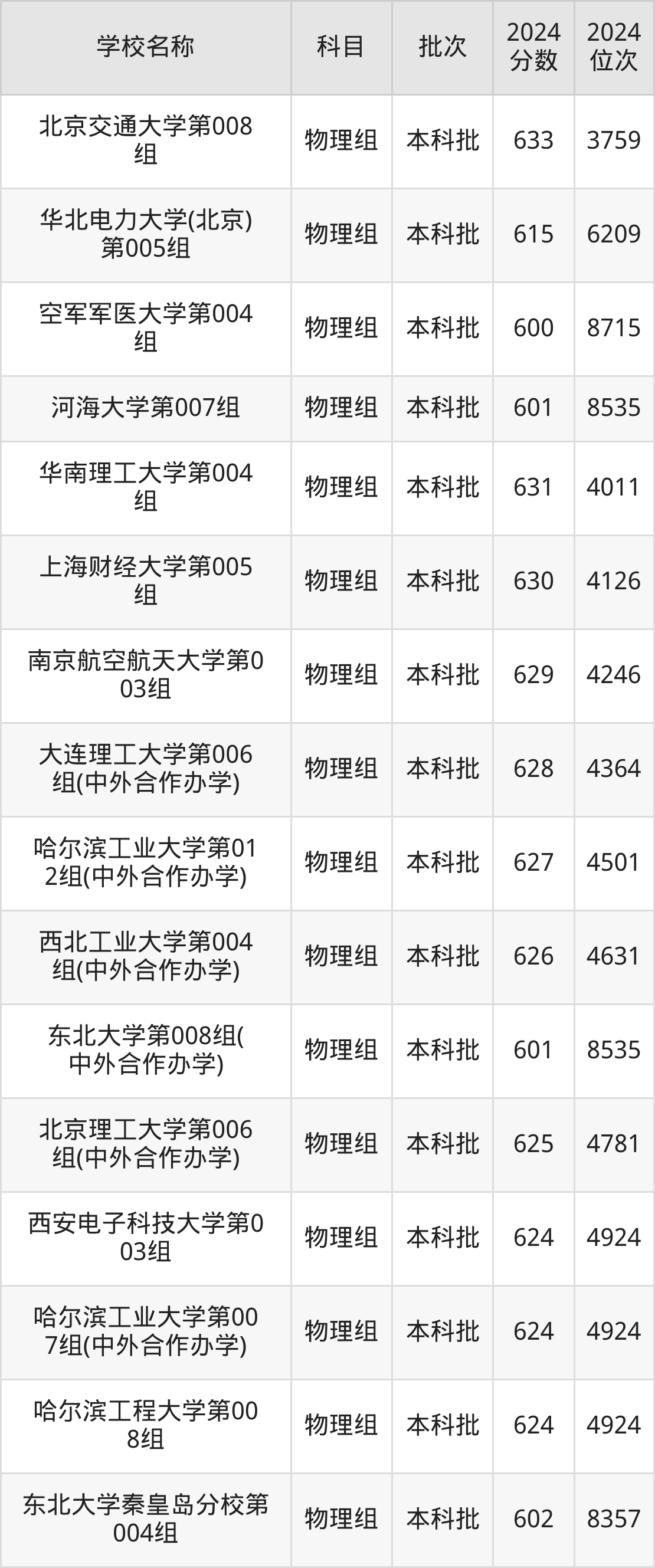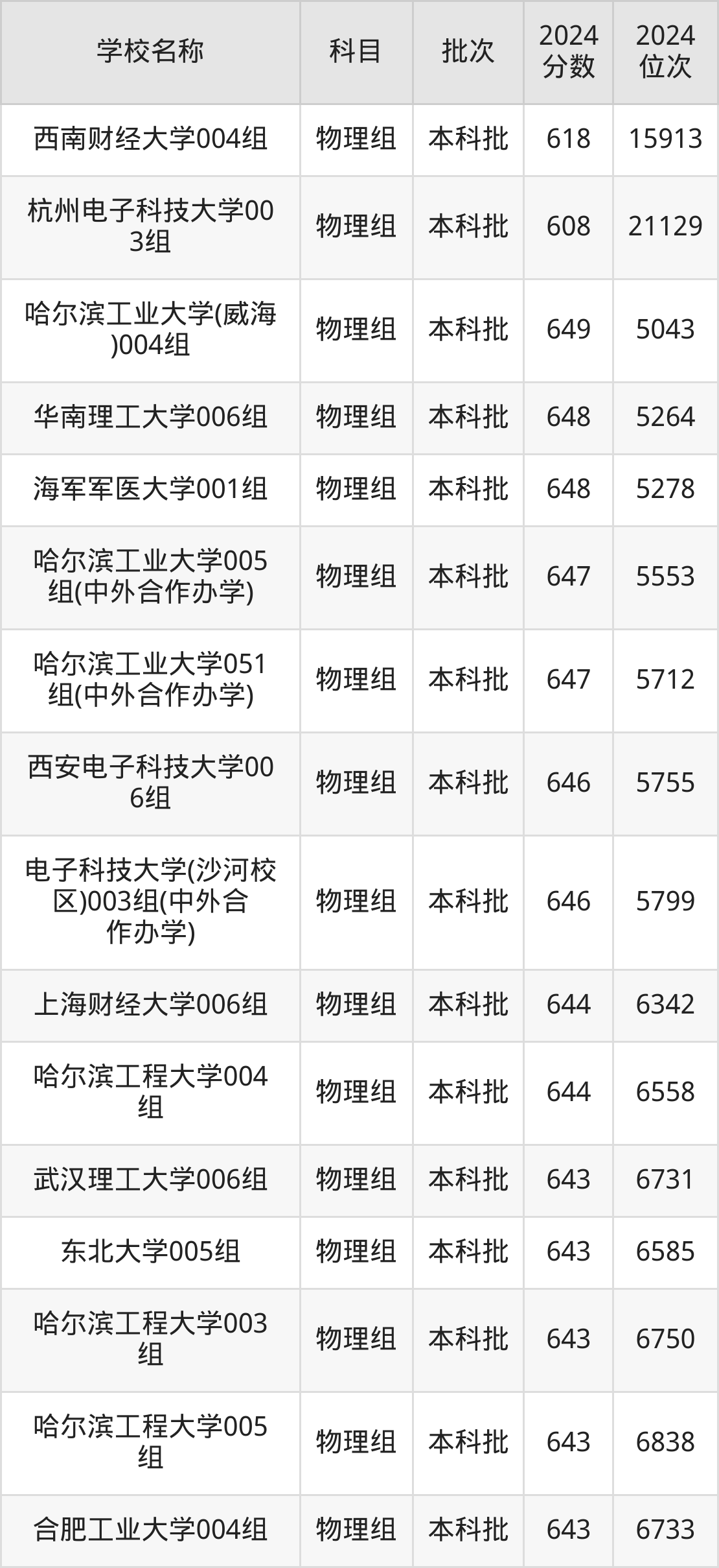 安徽高考物理组共有53所理科大学在600到650分之间录取,包含华南理工大学、北京交通大学、哈尔滨工业大学(威海)、海军军医大学、哈尔滨工业大学、西安电子科技大学、电子科技大学(沙河校区)、上海财经大学、哈尔滨工程大学、武汉理工大学。