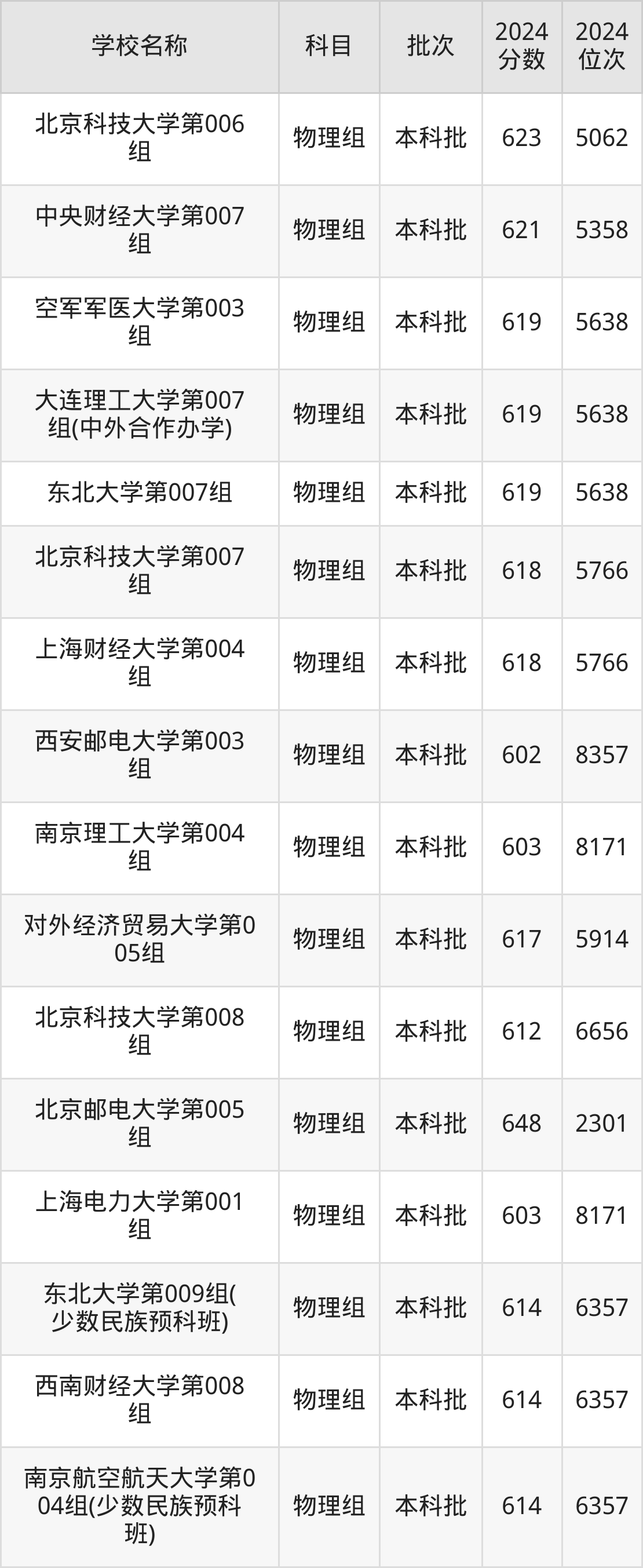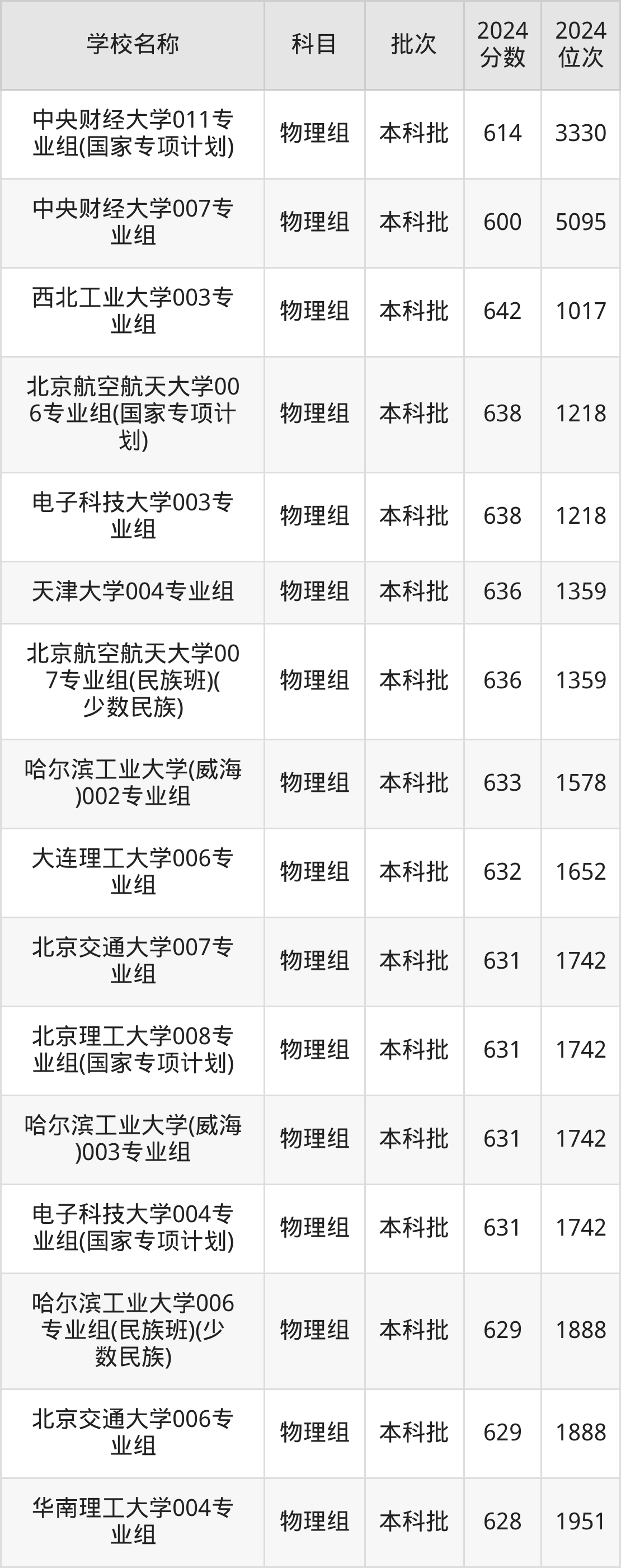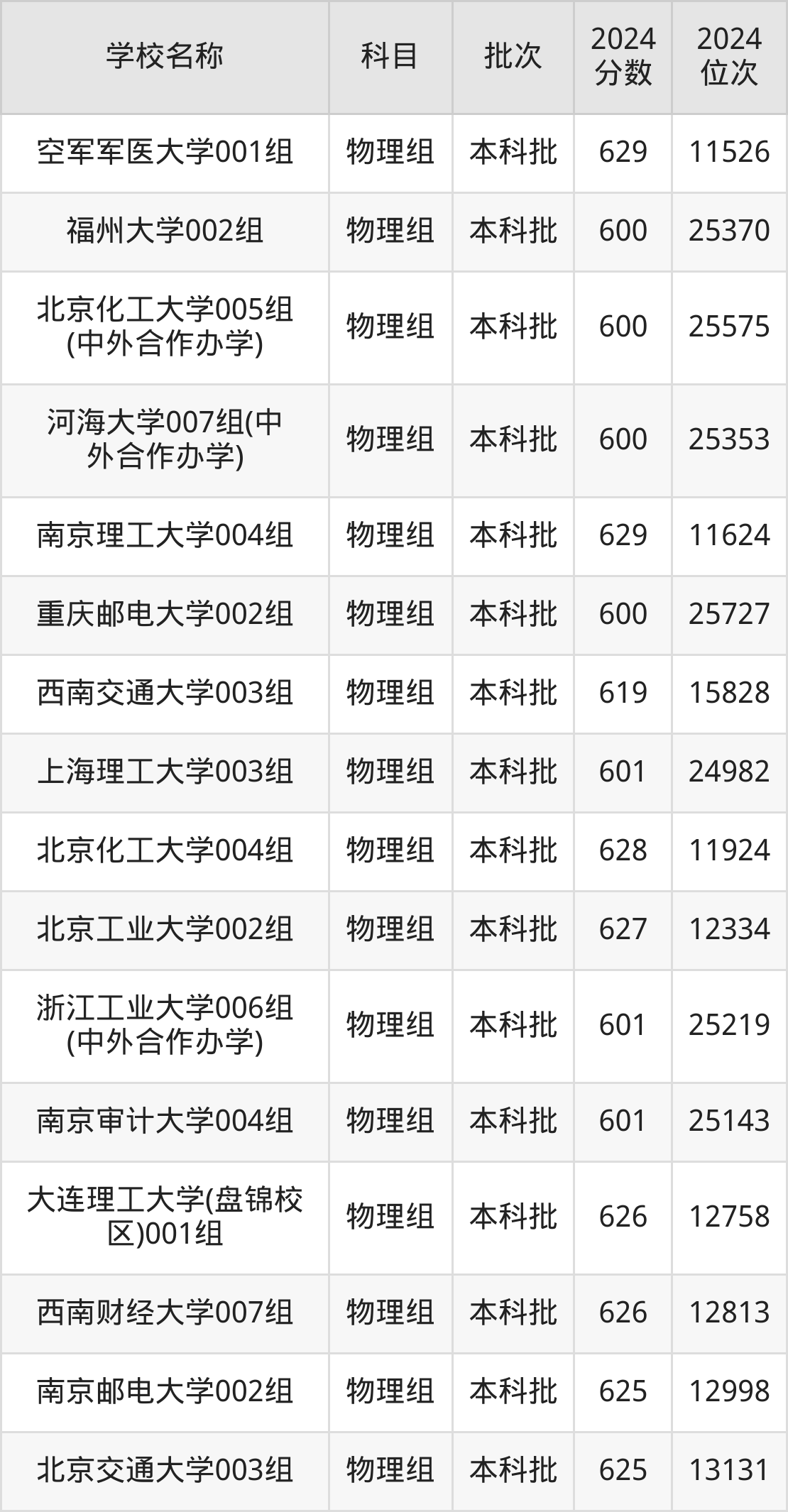 甘肃高考物理组共有25所理科大学在600到650分之间录取,包含中国科学技术大学、北京邮电大学、西北工业大学、北京航空航天大学、电子科技大学、天津大学、哈尔滨工业大学(威海)、大连理工大学、北京交通大学、北京理工大学。