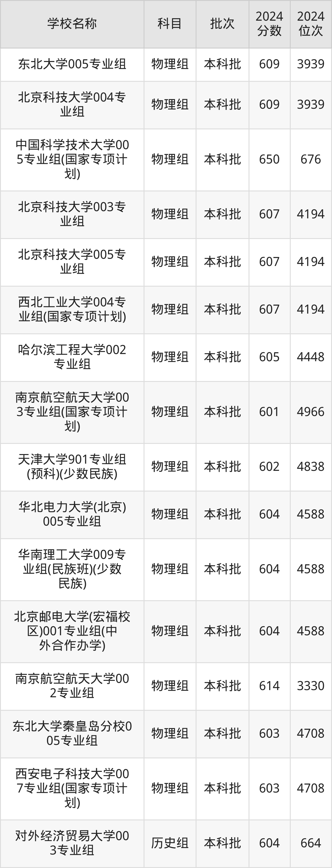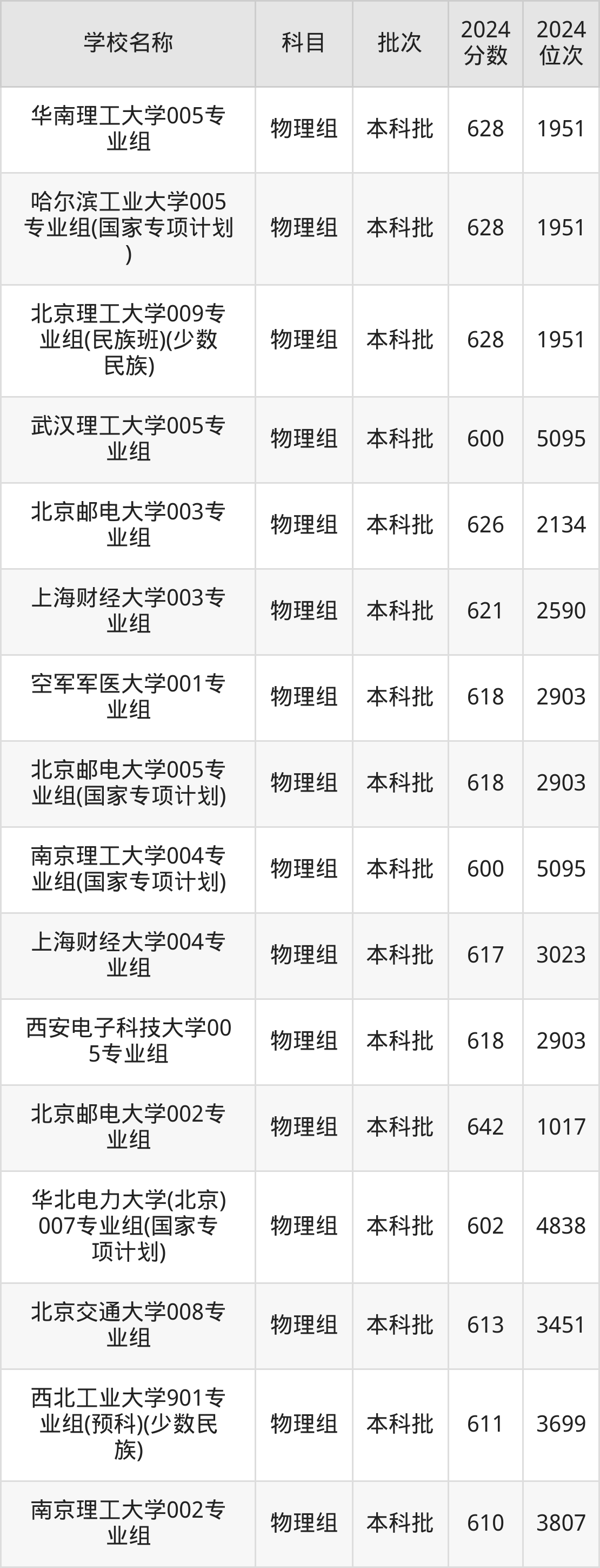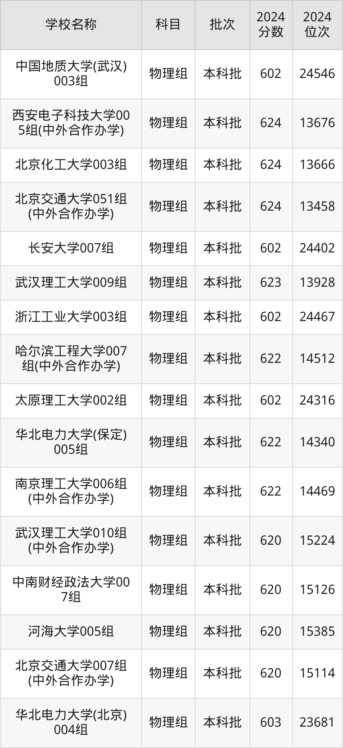 甘肃高考物理组共有25所理科大学在600到650分之间录取,包含中国科学技术大学、北京邮电大学、西北工业大学、北京航空航天大学、电子科技大学、天津大学、哈尔滨工业大学(威海)、大连理工大学、北京交通大学、北京理工大学。