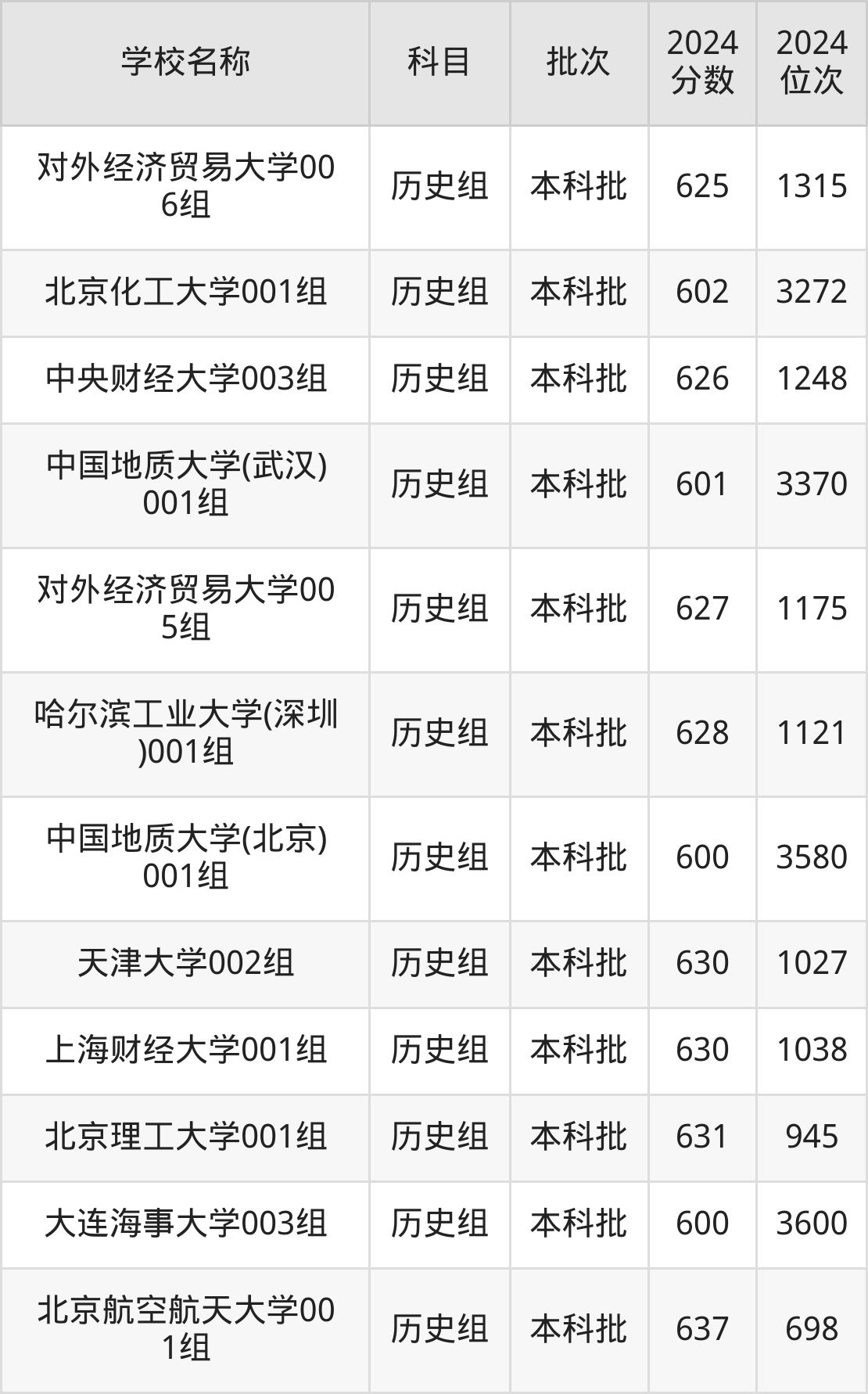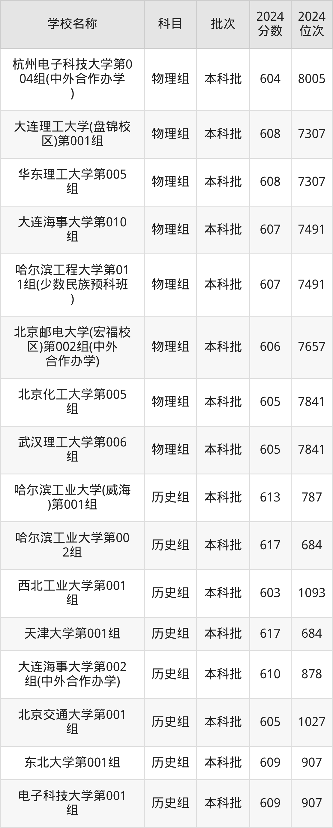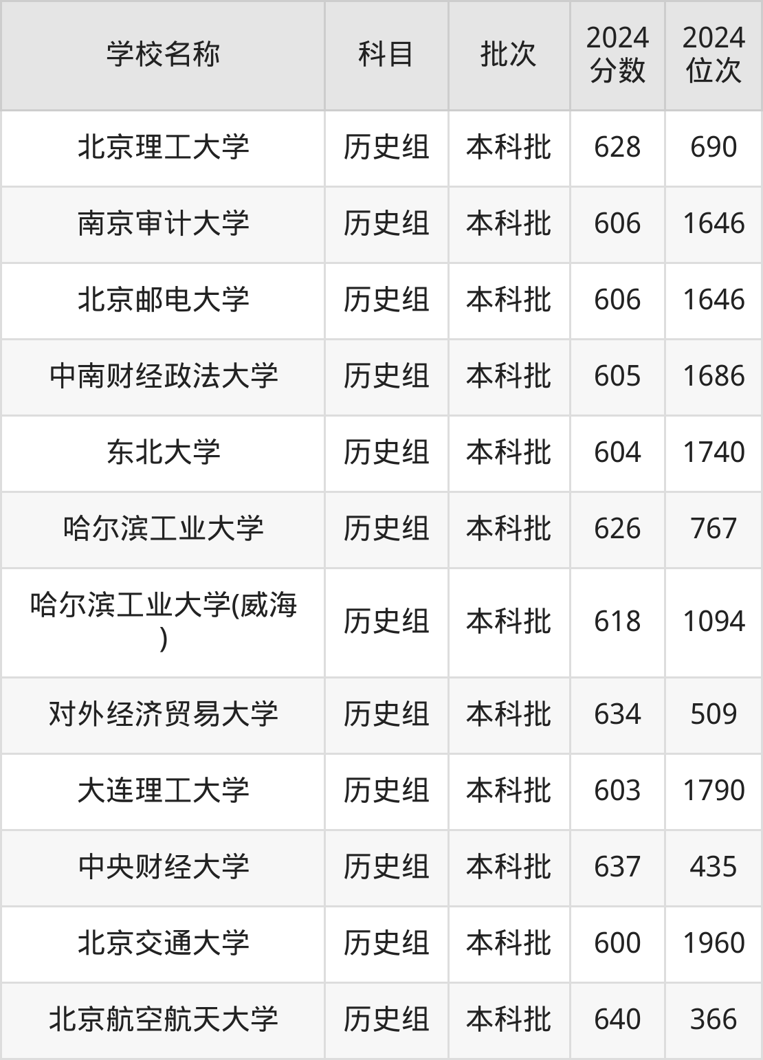 黑龙江高考历史组共有15所理科大学在600到650分之间录取,包含北京航空航天大学、上海财经大学、对外经济贸易大学、中央财经大学、北京理工大学、哈尔滨工业大学、天津大学、哈尔滨工业大学(深圳)、哈尔滨工业大学(威海)、大连海事大学。