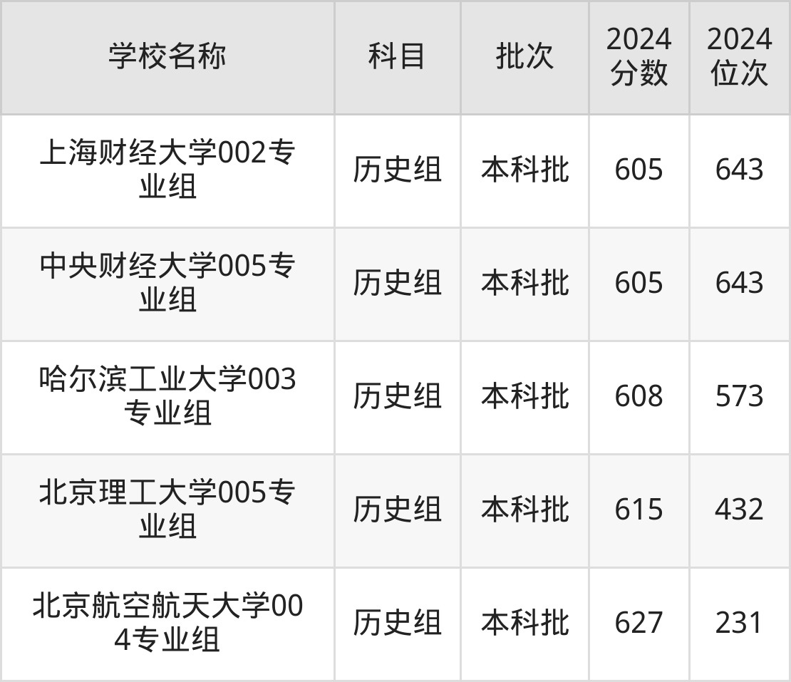 甘肃高考历史组共有6所理科大学在600到650分之间录取,包含北京航空航天大学、北京理工大学、哈尔滨工业大学、中央财经大学、上海财经大学、对外经济贸易大学。