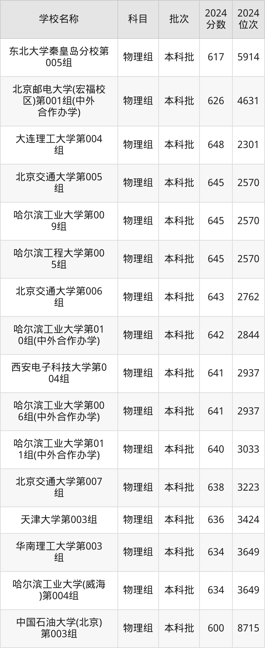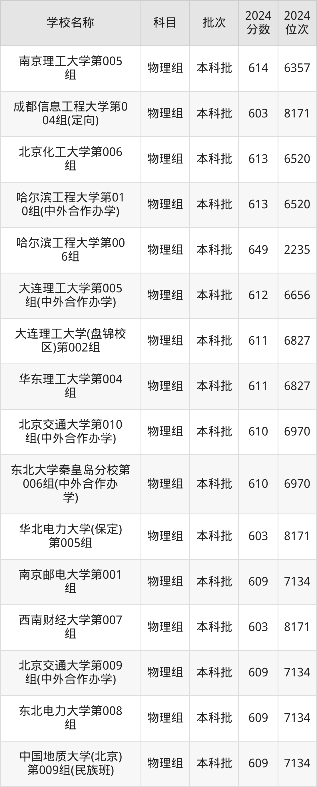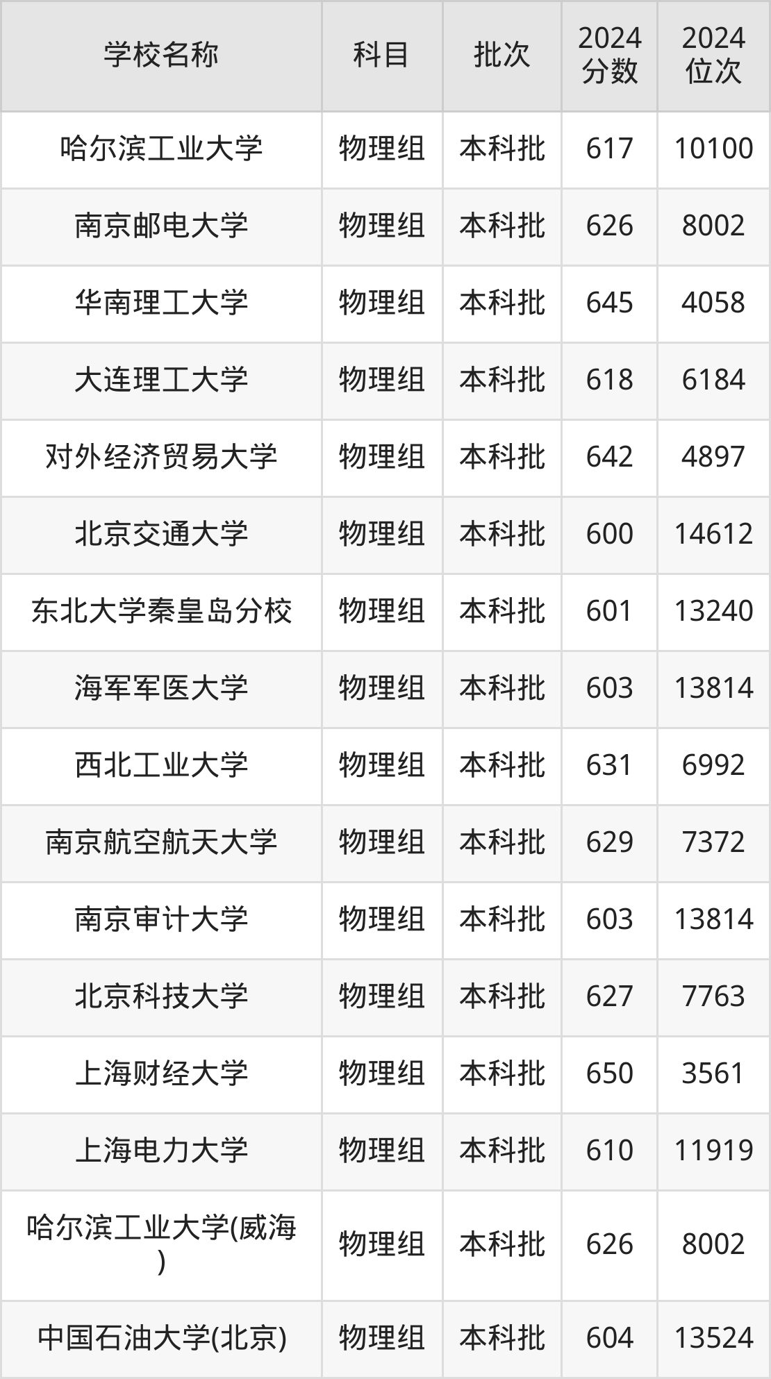 黑龙江高考物理组共有38所理科大学在600到650分之间录取,包含哈尔滨工程大学、北京邮电大学、大连理工大学、北京交通大学、哈尔滨工业大学、西安电子科技大学、天津大学、华南理工大学、哈尔滨工业大学(威海)、上海财经大学。